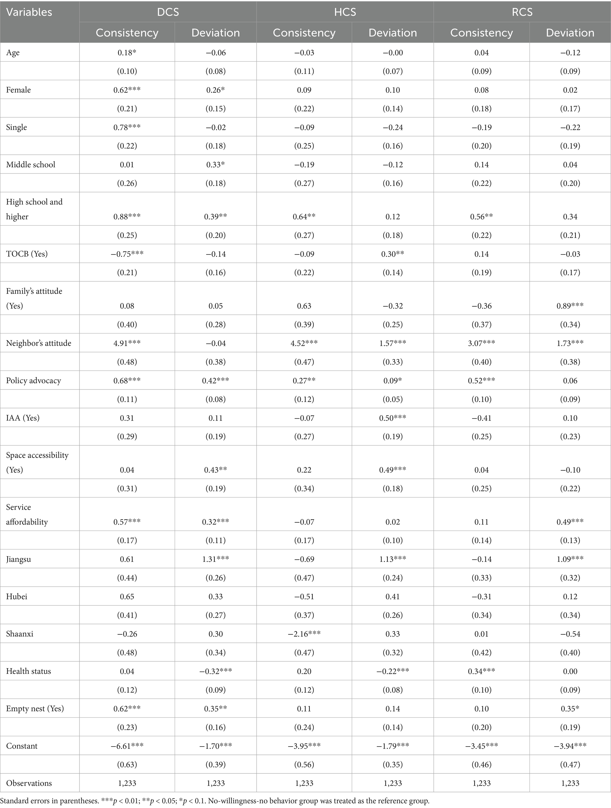 Thirdly, as the dependent variable of “willingness-behavior transformation” is a probability event, with three probable states of “willingness-behavior consistency (Y = 2),” “willingness-behavior deviation (Y = 1),” and “no willingness-no behavior (Y = 0),” the multinomial logistic regression models were used to further explore the factors influencing the willingness-behavior transformation of older adults to use CCSs. The model constructed in the Equation 2 is as follows: