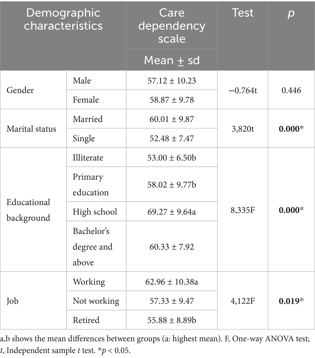 While there was no statistically significant difference between gender and care dependency scale score (p > 0.05), there was a statistically significant difference between marital status, educational status and occupations in terms of care dependency scale score (p < 0.05; Table 1). Bonferroni corrections were applied in all multiple group comparisons to control for type I error inflation.