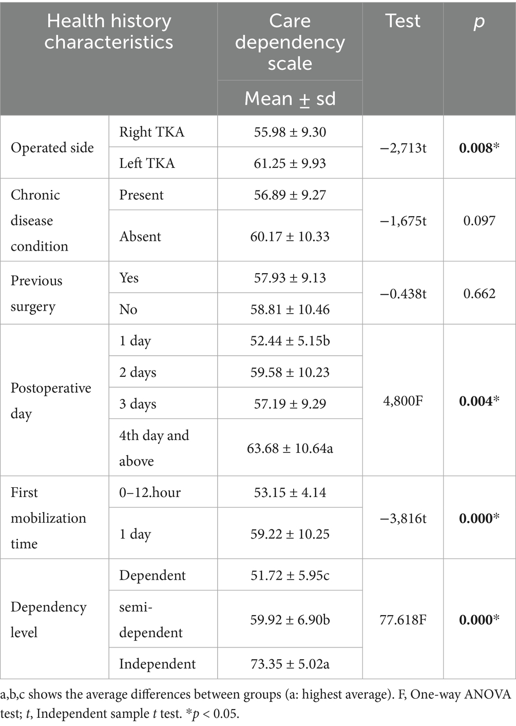 Table 2. Examination of the relationship between care dependency scale score and health history characteristics.