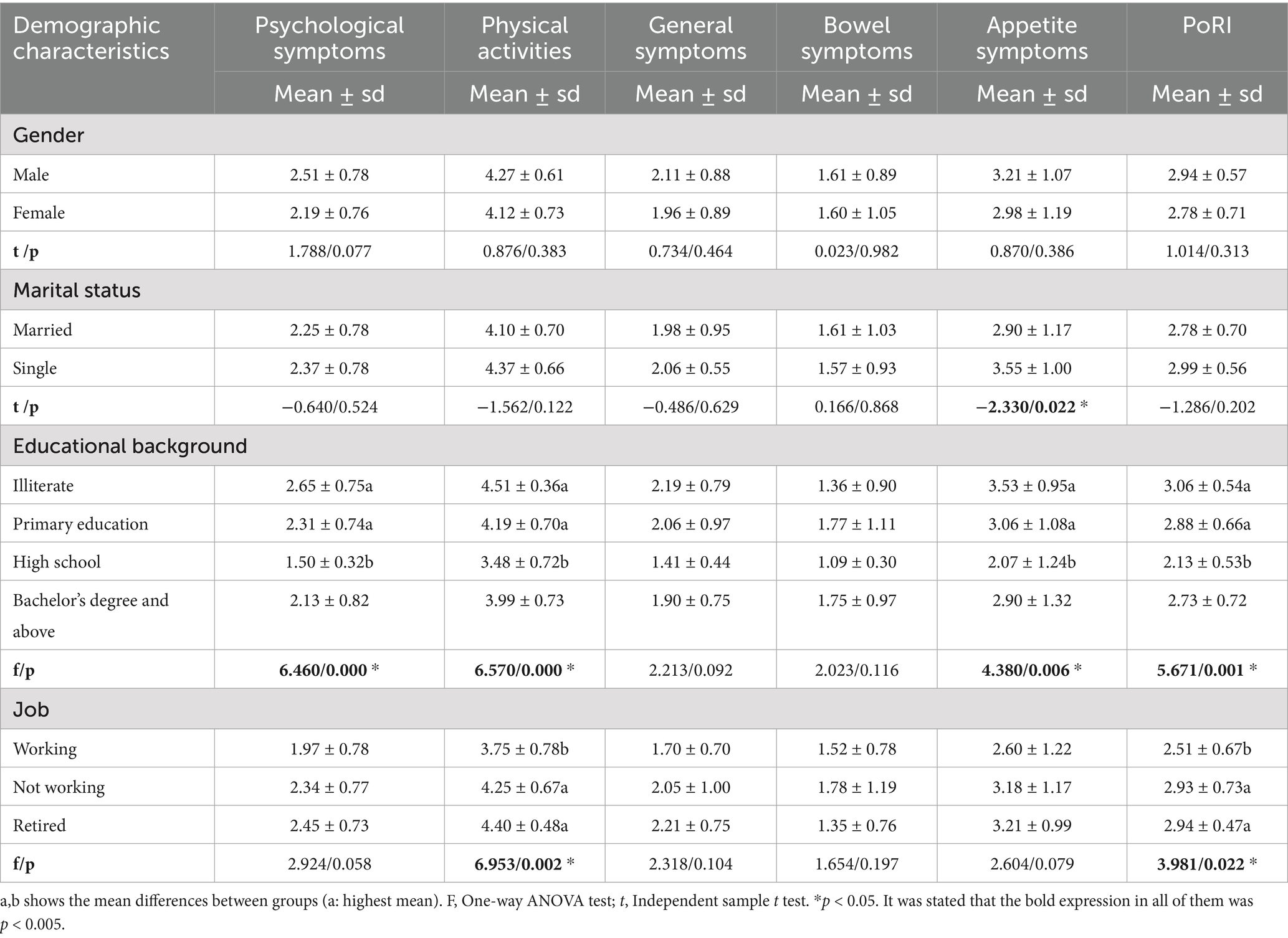 There is a statistically significant difference between marital statuses in terms of the appetite symptoms sub-dimension score (p < 0.05; Table 3). There is a statistically significant difference (p < 0.05) between the educational status in terms of postoperative recovery index scale and psychological symptoms, physical activities, and appetite symptoms sub-dimension scores (Table 3). There was a statistically significant difference (p < 0.05) between the occupations in terms of postoperative recovery index scale and physical activities sub-dimension scores (Table 3). There was no statistically significant difference between genders in terms of postoperative recovery index scale and sub-dimension scores (p > 0.05; Table 3).
