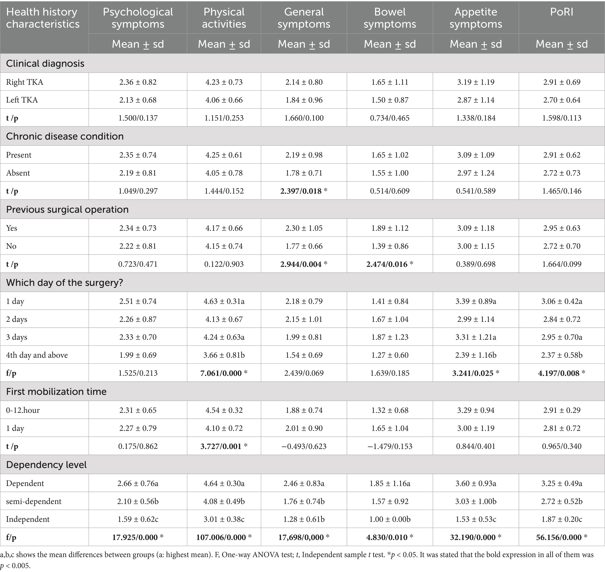 The mean age of the patients was 63.90 ± 7.87 years, 75.0% were female, 79.0% were married, 55.0% were primary school graduates and 49.0% were not working. While 50% of the patients had right TKA, 53% had chronic diseases. The rate of previous surgery was 43 and 18% were on the first postoperative day. The first mobilization time of 84% of the patients was on the first day and the dependency level of 46% was found to be dependent. The care dependency scale score was 58.43 ± 9.87 and the total postoperative recovery index score (PoRI) was 2.82 ± 0.68, while the psychological symptoms sub-dimension score was 2.27 ± 0.78, the physical activities sub-dimension score was 4.16 ± 0.70, the general symptoms sub-dimension score was 2.00 ± 0.88, the bowel symptoms sub-dimension score was 1.60 ± 1.01 and the appetite symptoms sub-dimension score was 3.03 ± 1.16.