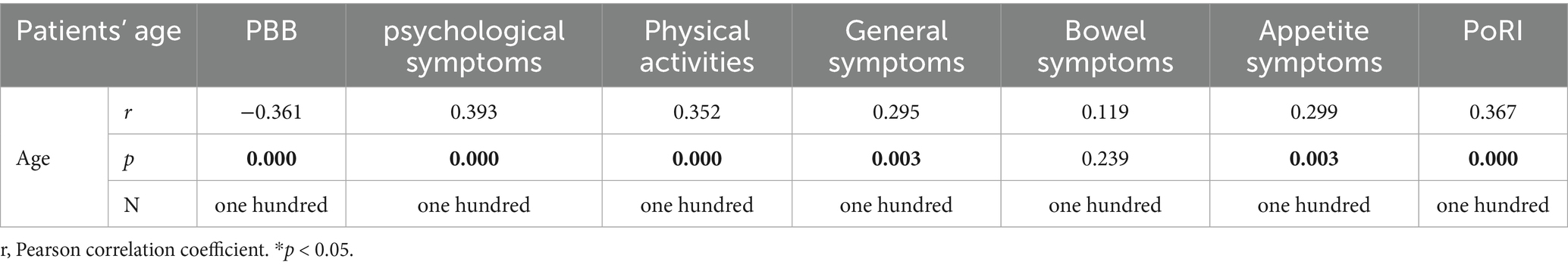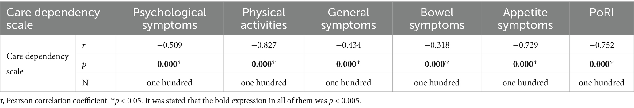 There is a statistically significant negative correlation between age and care dependency scale, and a statistically significant positive correlation between age and postoperative recovery index and psychological symptoms, physical activities, general symptoms, appetite symptoms subscale scores (p < 0.05; Table 8).
