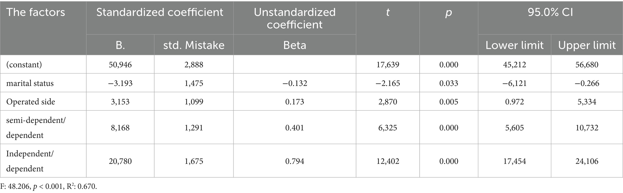 Marital status, clinical diagnosis and dependency levels have a statistically significant effect on the care dependency scale score. Accordingly, the care dependency scale score of the married patients was 3.193 units higher than the single patients, the care dependency scale score of the left TKA patients was 3.153 units higher than the right TKA patients, the care dependency scale score of the semi-dependent patients was 8.168 units higher than the dependent patients, and the care dependency scale score of the independent patients was 20.780 units higher than the dependent patients (Table 6).