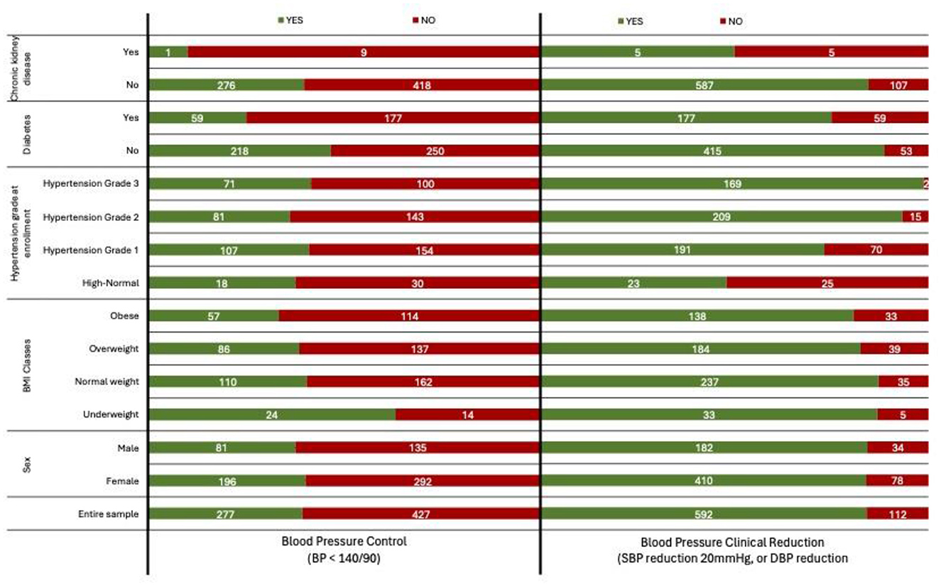 A clinically significant blood pressure reduction was achieved in 86.7% of patients (n = 569). In descriptive analysis as reported in Table 1, patients with Grade 3 hypertension had the highest proportion of BP reduction (n = 169/171, 98.8%), followed by Grade 2 (n = 209/224, 93%) and Grade 1 (n = 191/261, 73,1%). Obese patients had a slightly higher proportion of BP reduction (p = 0.022), while CKD patients had a lower proportion (p = 0.098). No significant associations were found for sex (p = 1.000) or diabetes (p = 0.097).