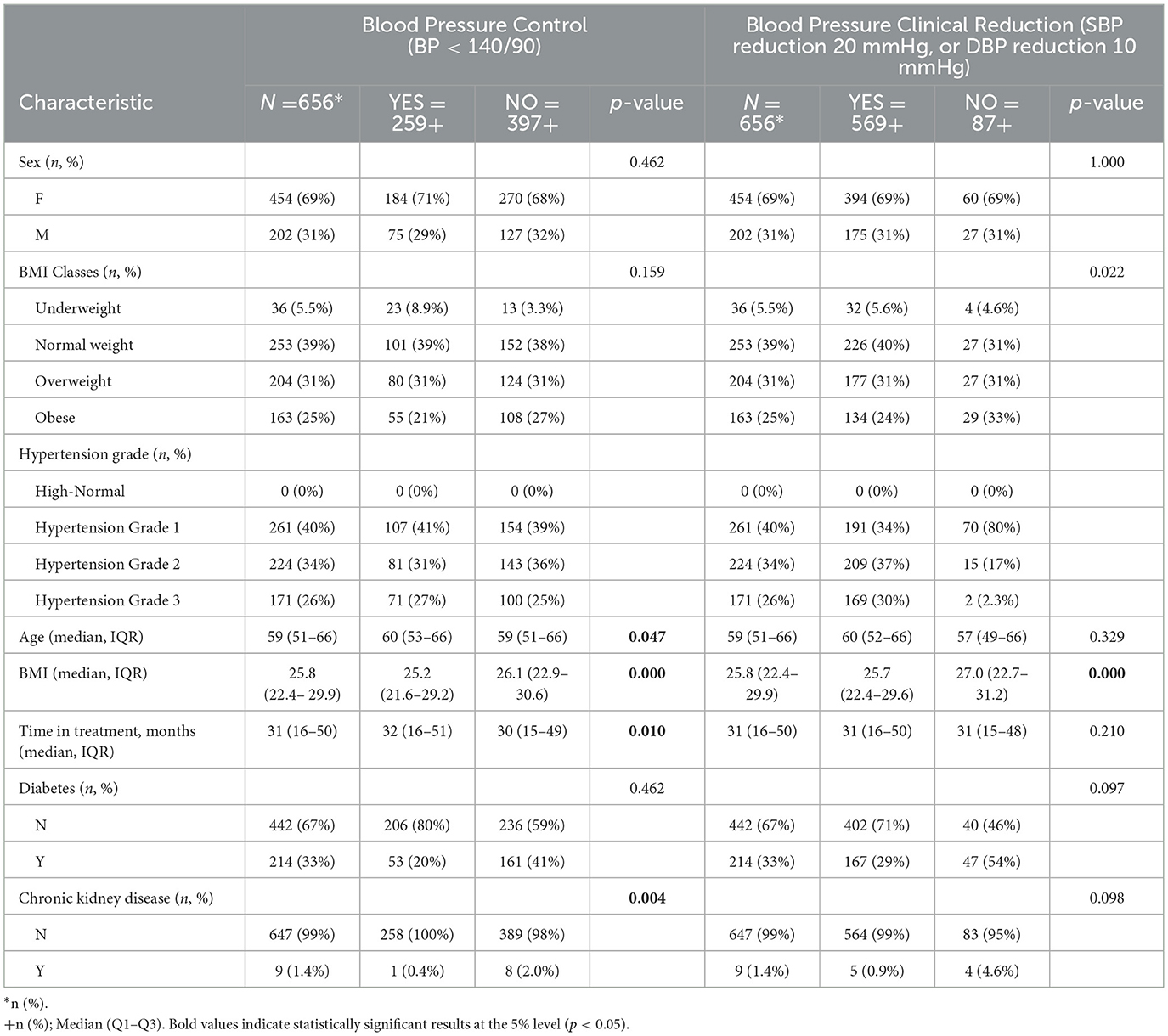 BP measurements were extracted from patients' first and most recent visits to evaluate two key outcomes: BP control and BP clinical reduction. BP control was defined as achieving BP values < 140/90 mmHg according to international guidelines (13). Clinically significant BP reduction was defined as a reduction of ≥20 mmHg in systolic BP or ≥10 mmHg in diastolic BP. This threshold was selected based on evidence from clinical research and international guidelines, which have demonstrated that such reductions are associated with a meaningful decrease in cardiovascular risk and events, including stroke and myocardial infarction (13–16).