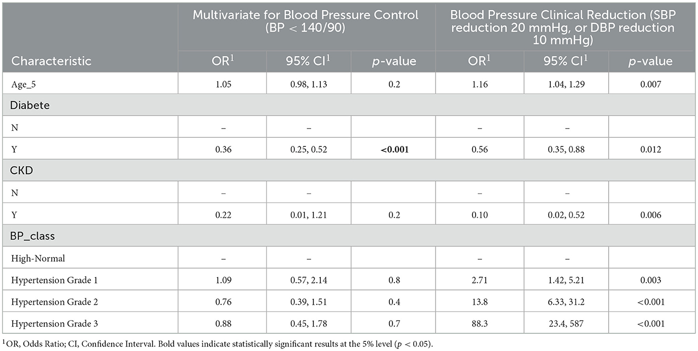 In the multivariate analysis (Table 2), diabetes (OR = 0.56; 95% CI: 0.35–0.88; p = 0.012) and CKD (OR = 0.10; 95% CI: 0.02–0.52; p = 0.006) were independently associated with a lower likelihood of achieving a clinically significant BP reduction. Given the very small size of the CKD subgroup (n = 9), the corresponding odds ratios should be interpreted with caution.
