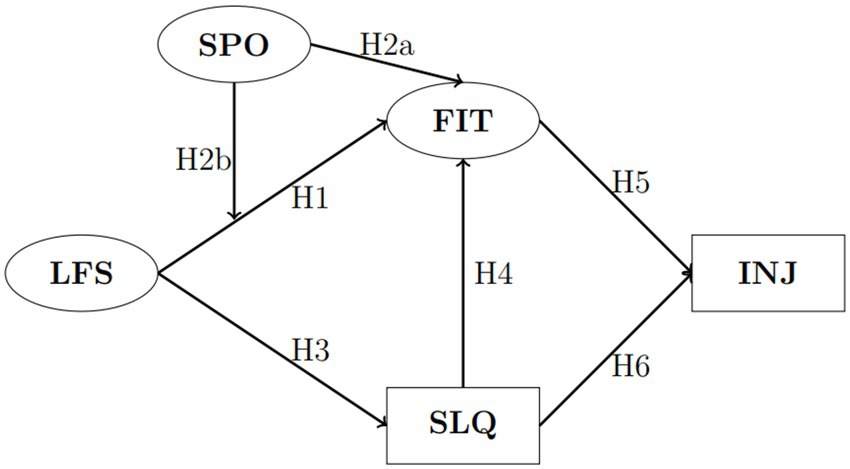 Figure 1. Research model. Circles represent latent (multi-item) estimated variables, and rectangles represent single-item variables. LFS, lifestyle; SPO, sport; FIT, fitness; SLQ, sleeping quality; INJ, number of injuries.
