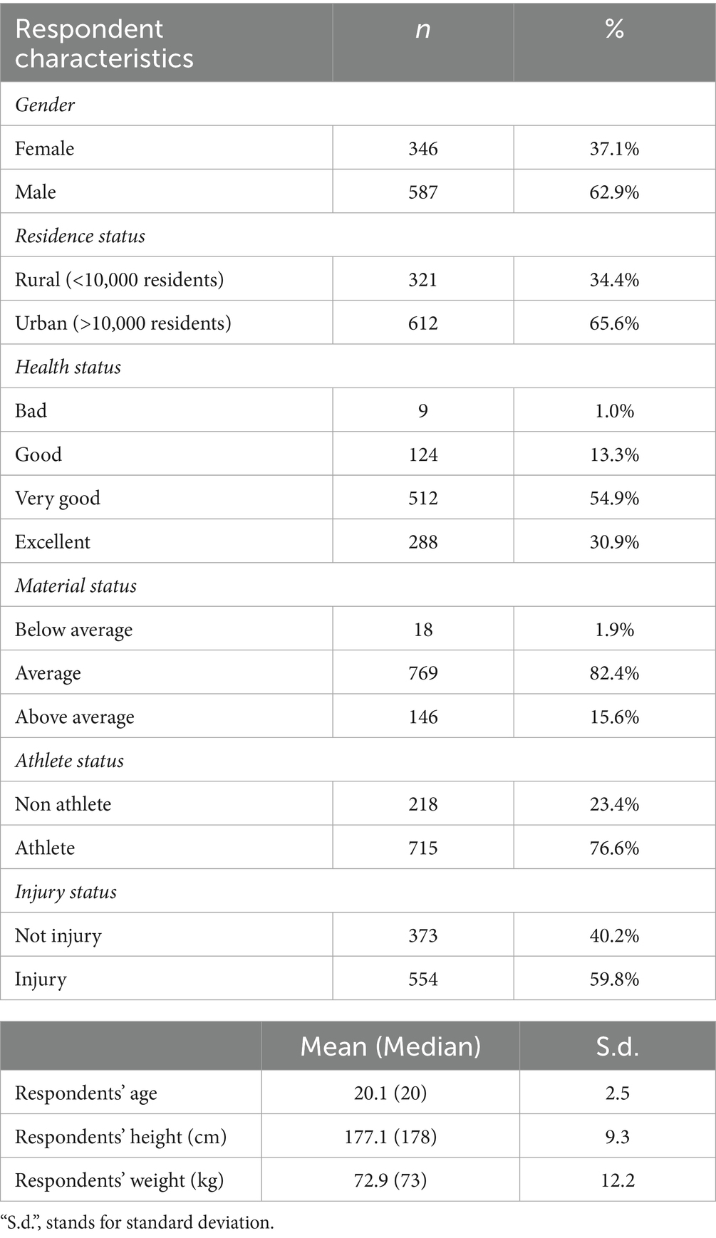 Material status, used as a proxy for socioeconomic standing, was overwhelmingly rated as “average” by respondents (n = 769; 82.4%), with fewer individuals identifying as either “below average” (n = 18; 1.9%) or “above average” (n = 146; 15.6%). Most of the sample (n = 715; 76.6%) identified as athletes, suggesting a strong representation of physically active individuals. In contrast, non-athletes comprised 23.4% (n = 218) of the cohort. Notably, 59.8% (n = 554) of participants reported having sustained at least one injury, compared to 40.2% (n = 373) who had not, which may be related to the high proportion of athletes in the sample.