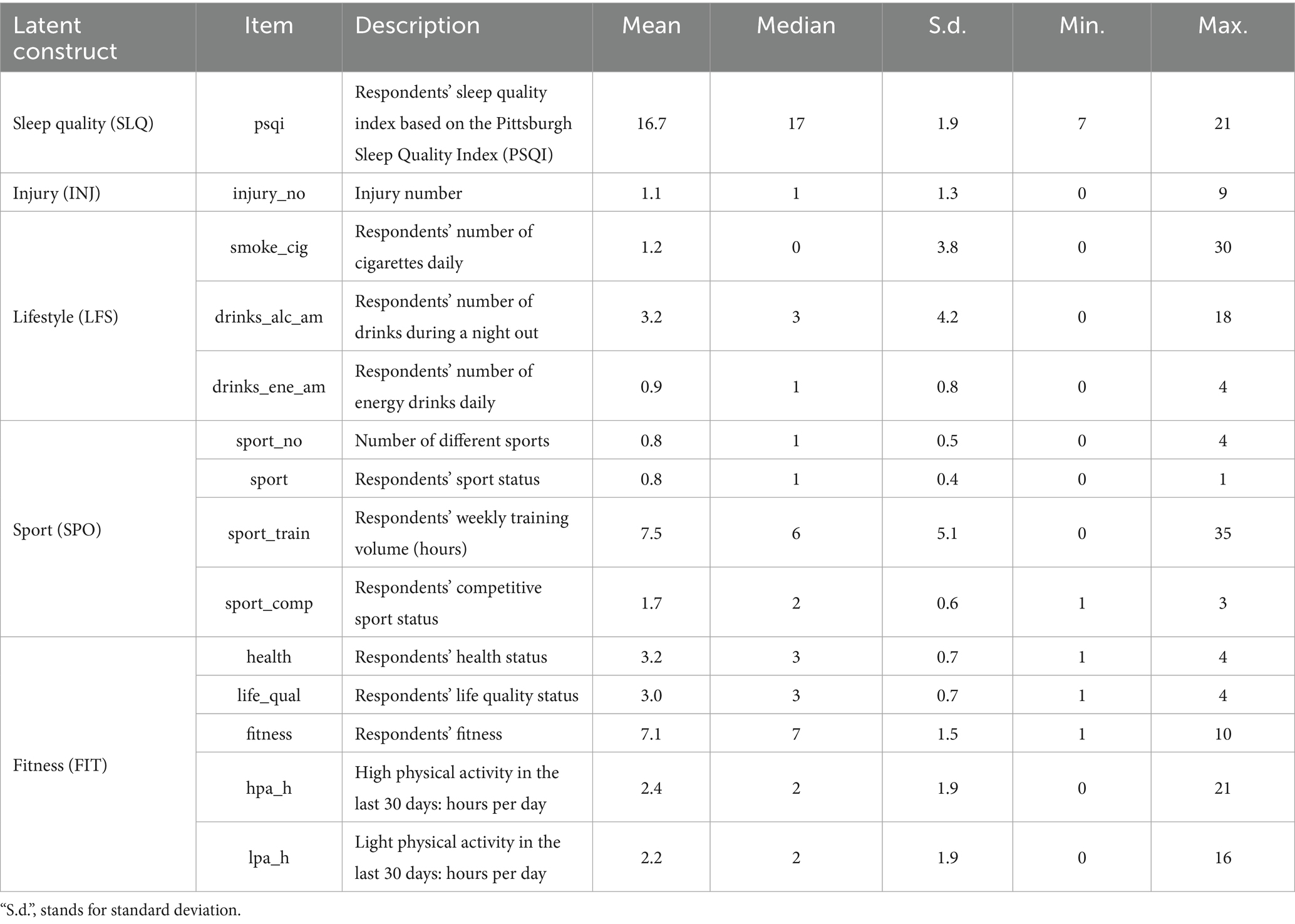 Table 2 presents the descriptive statistics of all observed variables forming the latent constructs used in the model. The mean PSQI-based sleep quality score (after inversion for interpretability) indicates generally good sleep among respondents (mean = 16.7 ± 1.9), while the average number of injuries reported during the academic year was relatively low (mean = 1.1 ± 1.3). Lifestyle indicators show limited smoking (mean = 1.2 cigarettes/day) and moderate alcohol consumption during nights out (mean = 3.2 drinks), with low energy-drink intake (mean = 0.9 per day). Sport-related variables reveal high engagement in physical activity—students trained on average 7.5 h per week, most were active athletes (mean = 0.8 ± 0.4), and two-thirds competed at least at the local level (mean = 1.7 ± 0.6). Fitness-related indicators suggest overall favorable self-rated health (mean = 3.2 ± 0.7) and life quality (mean = 3.0 ± 0.7), with a mean perceived fitness of 7.1 ± 1.5 on a 10-point scale. Students reported approximately 2.4 h of high-intensity and 2.2 h of light physical activity per day during the previous month.