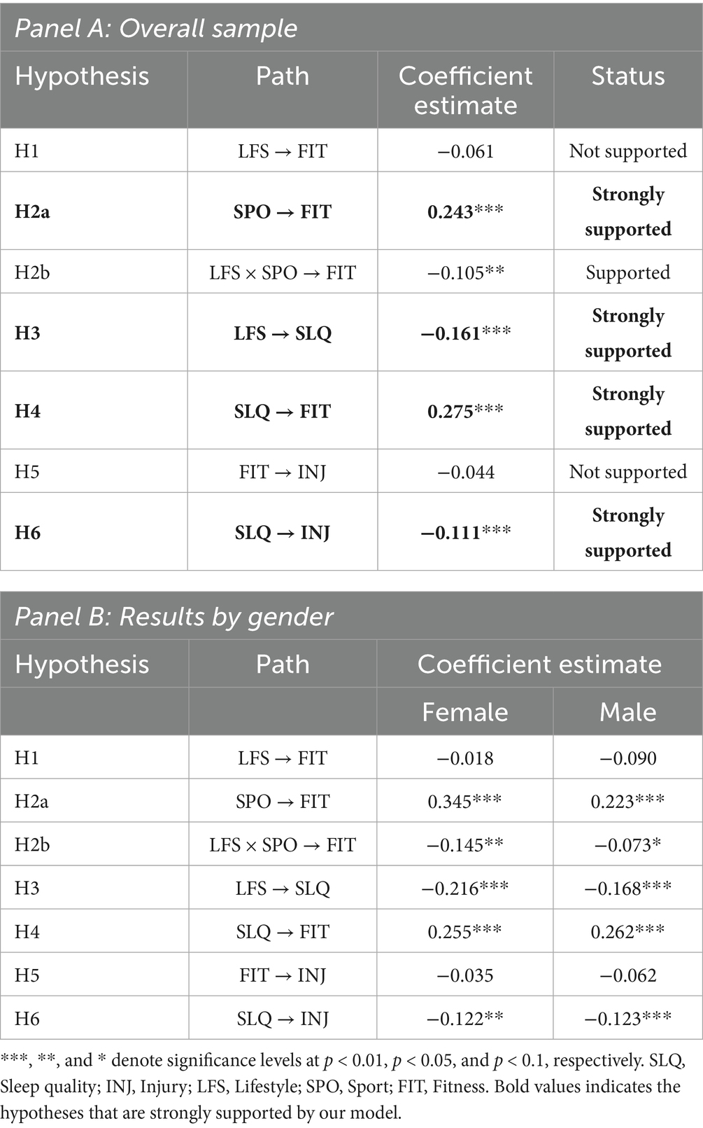 Results of our structural model are presented in Table 3, Panel A. The relationship between lifestyle habits (LFS) and perceived physical fitness (FIT) was found to be negative but not statistically significant. This indicates that, although unhealthy lifestyle behaviors such as smoking, alcohol, and energy drink consumption are generally detrimental to physical fitness, this effect was not sufficiently strong or consistent in the current sample to reach statistical significance. Therefore, H1 is not supported.