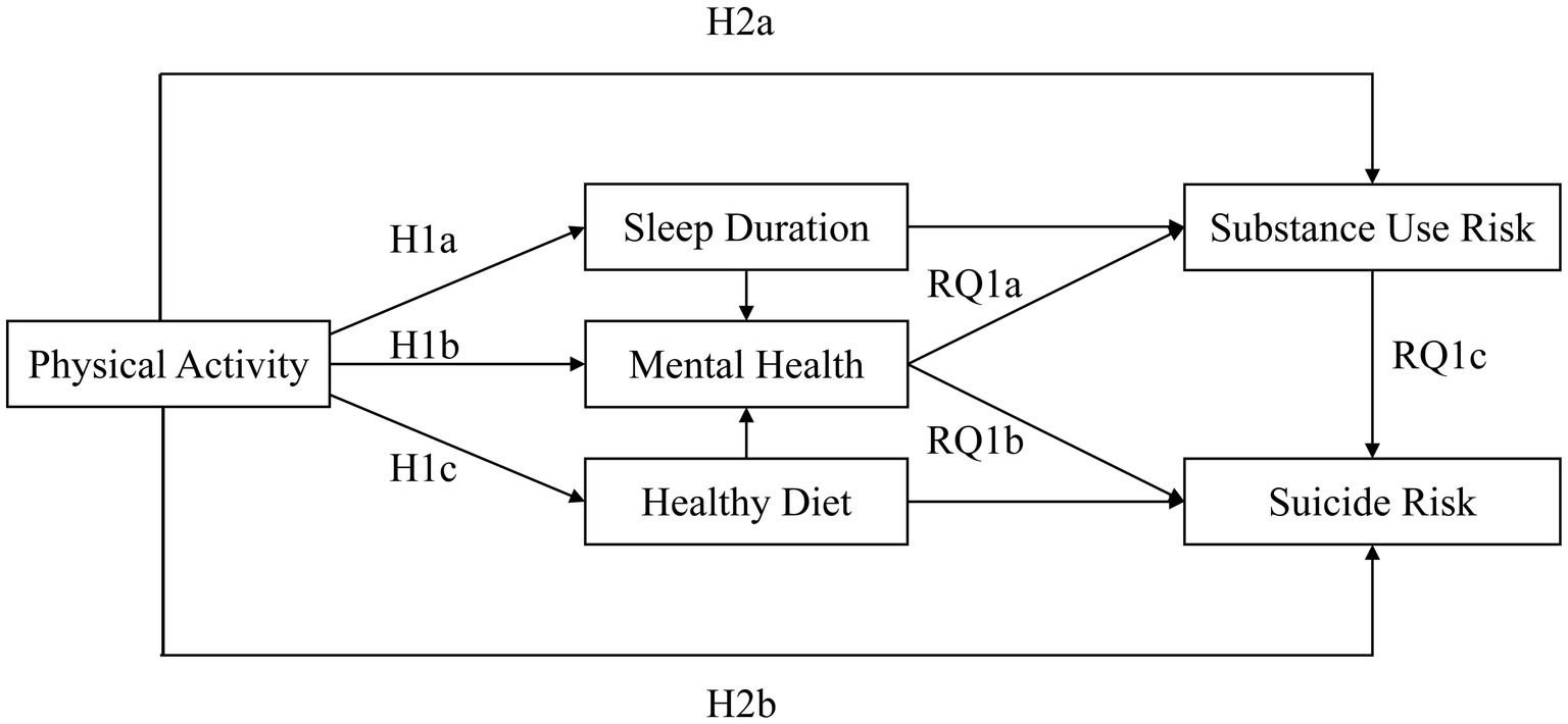 The complex mediating roles of sleep duration (SD), healthy diet (HD), and mental health (MH) in the associations between PA, SR, and SUR among adolescents warrant further examination. Although direct significant relationships have been identified among SD, HD, MH, SR and SUR, research specifically focusing on adolescents remains limited. For example, a meta-analysis has identified that insomnia can prospectively predict suicidal thoughts and behaviors (37). Sleep disturbances can also be an important risk factor for SR and suicide attempts among otherwise healthy adolescents (38). A healthy diet, such as the Mediterranean diet, may prospectively reduce depressive symptoms, and depression is one of the key antecedent factors associated with increased suicide risk (39). Moreover, individuals with depression are estimated to have a 20-fold increased risk of suicide compared to the general population. Depression is currently recognized as one of the most well-established and stable predictors of suicide (40). Depression and SUR are highly comorbid and exert bidirectional influences. On one hand, depression may lead to substance misuse through a self-medication mechanism; on the other hand, SUR can exacerbate depressive symptoms and increase the risk of suicide (41). Individuals with SUR exhibit significantly elevated suicide risk, with ORs typically ranging from 2.5 to 7.5. The risk is particularly pronounced among individuals with polysubstance use, as well as those using alcohol and opioids (42). Given the established associations among PA, SR, and SUR, it is worth exploring whether SD, HD, and MH may serve as potential mediators in these relationships. Accordingly, we propose the following research question: