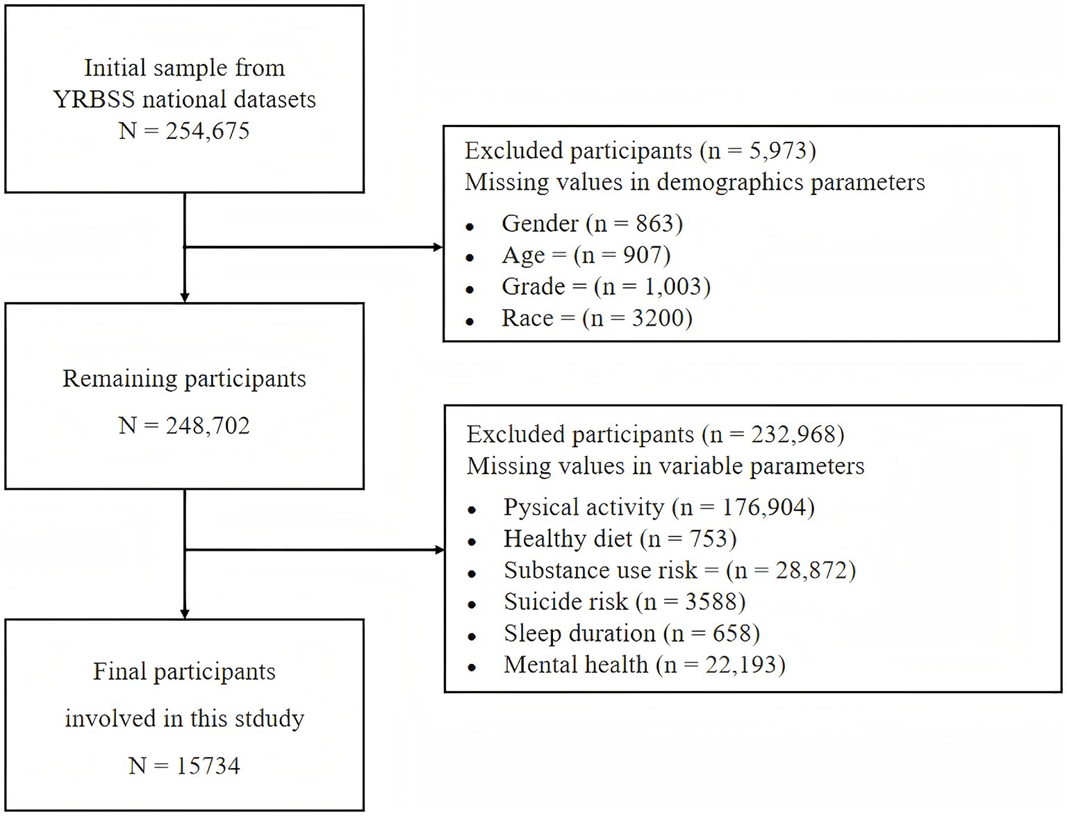 The 2023 TRBSS dataset included 254,675 respondents. Figure 2 illustrates the sample filtering process. Participants with missing values in key demographic covariates were excluded, namely gender (n = 863), age (n = 907), grade (n = 1,003), and race (n = 3,200), resulting in a remaining sample of 248,702. Subsequently, participants with missing values on core study variables were also excluded. These variables included PA, HD, SUR, SR, SD, and MH. After excluding participants with missing data on any of variables, the final analytic sample comprised 15,734 participants.
