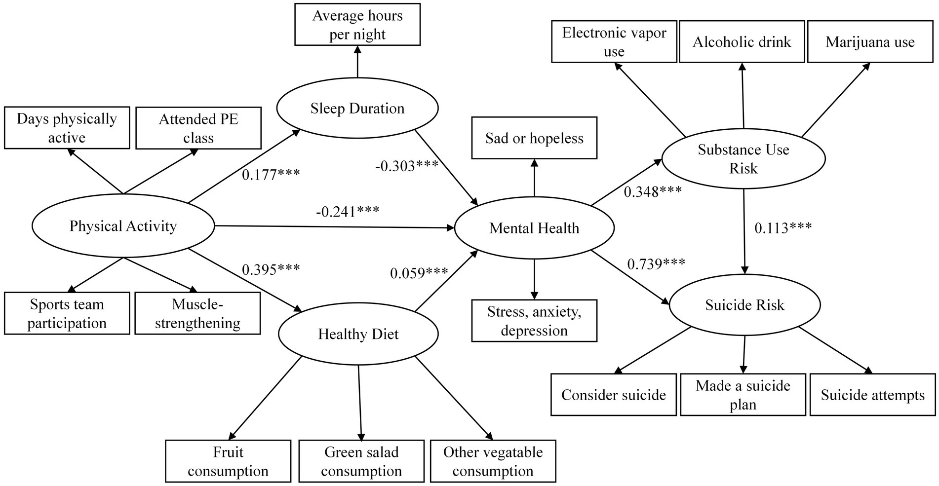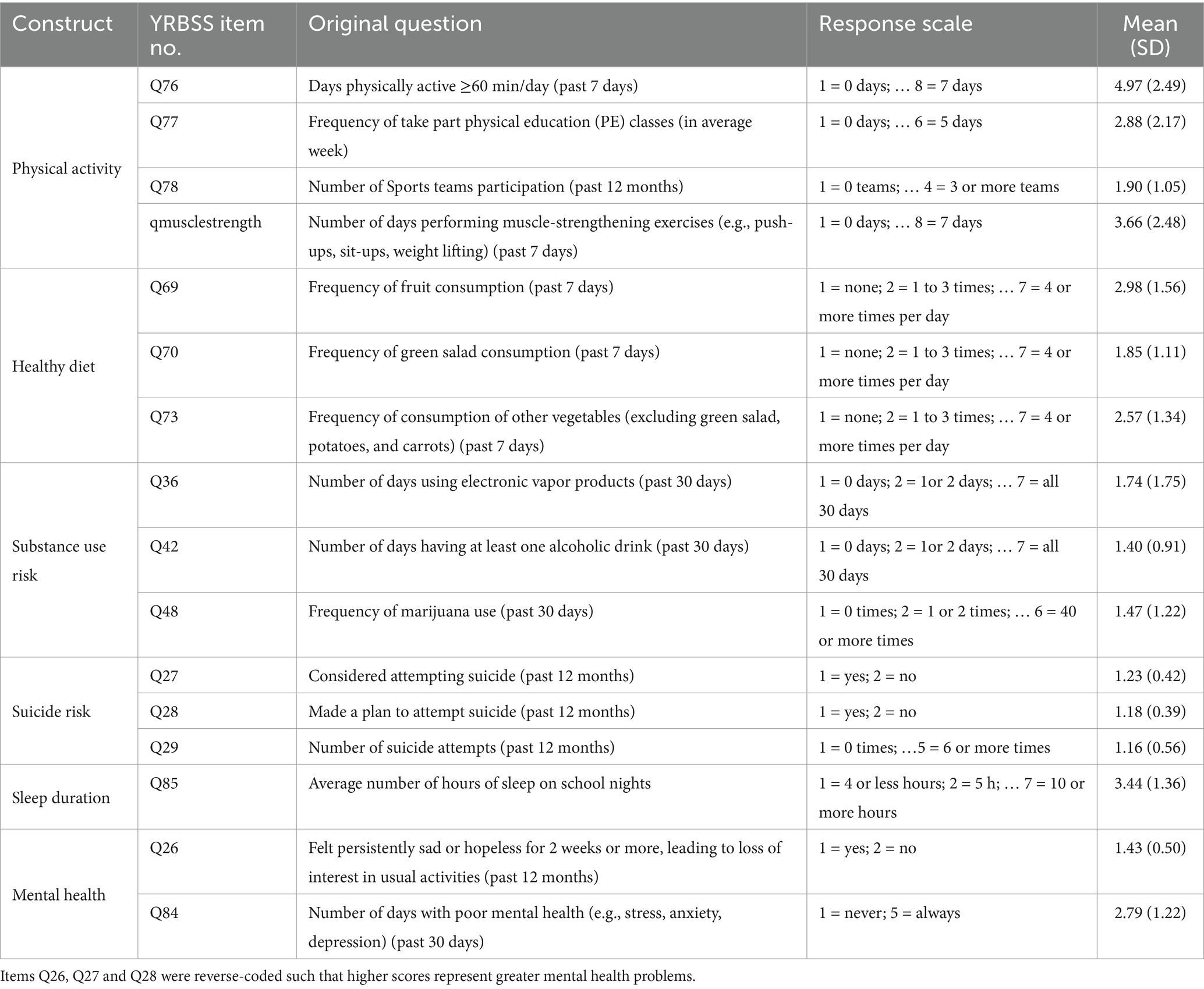 PA was assessed using four items: frequency of being PA for at least 60 min per day in the past week (Q76), frequency of physical education (PE) class attendance in a typical week (Q77), number of sports teams participated in over the past 12 months (Q78), and frequency of muscle-strengthening activities such as push-ups or weight lifting in the past 7 days (Qmusclestrength). All items were coded so that higher scores reflected higher levels of PA. For example, Q76 ranged from 1 (“0 day”) to 8 (“7 days”), with greater values indicating more frequent PA. These items were treated as indicators of the latent PA construct in the SEM. The internal consistency of the PA construct was acceptable in this study (Cronbach’s α = 0.670).