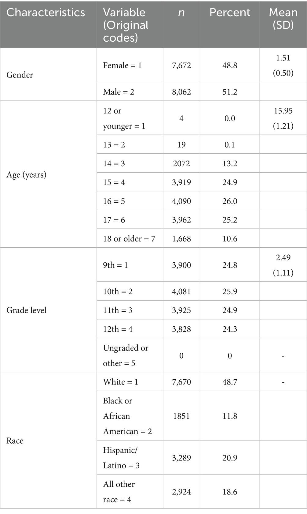 Table 2 presents the covariate variables included in this study. Among the final sample, the gender distribution was nearly balanced, with 7,672 females and 8,062 males. Age was categorized into seven groups, ranging from 12 or younger to 18 or older. The distribution approximated normality, with the majority of participants aged 15 (24.9%), 16 (26.0%), and 17 (25.2), which aligns with the typical adolescent age range.