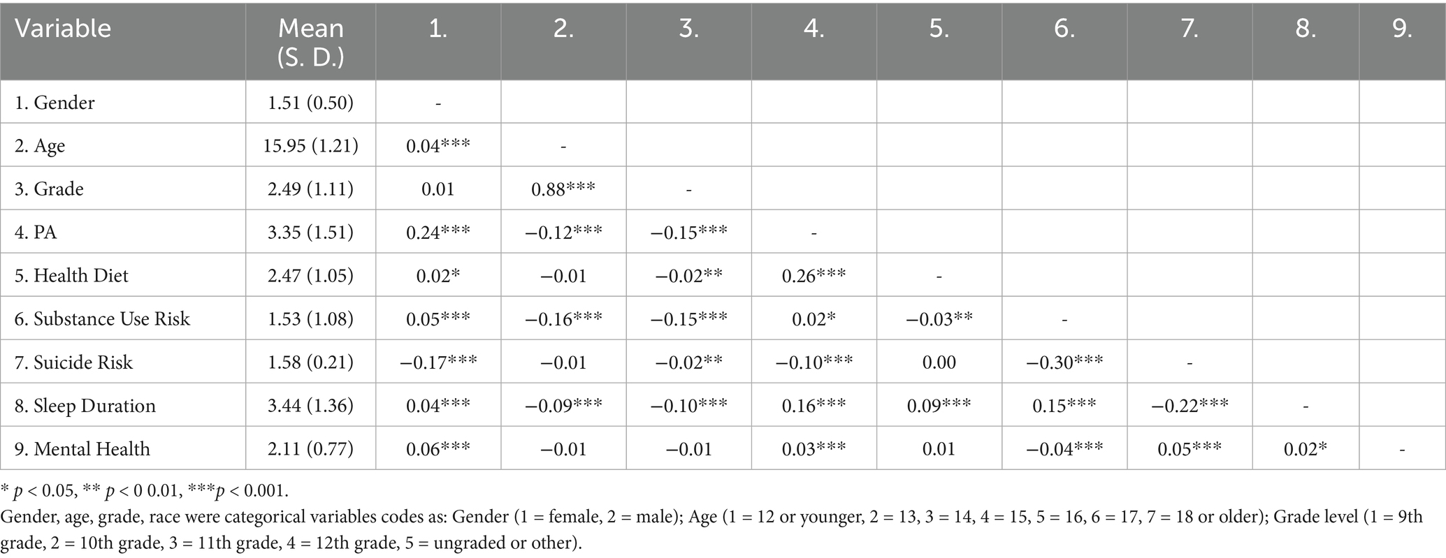 Participants were primarily in grades 9 through 12, with a relatively even distribution across grade levels and a mean grade level of 2.49. Regarding race, White participants comprised the largest group (48.7%), followed by Hispanic/Latino, Black or African American, and other racial categories. We reported frequencies, percentages, and means with standard deviations to provide a comprehensive overview of sample characteristics. All variables included in the correlation matrix were either continuous or ordinal and were treated as approximately continuous.