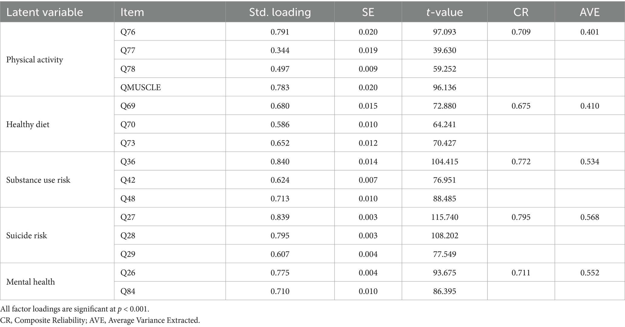 The YRBSS is designed as a surveillance tool that provides observed behavioral indicators rather than latent constructs, and it does not require factor validation such as AVE or CR (49). However, in order to increase the measuring accuracy, we still tried to construct a latent variable (e.g., mental health, substance use risk) in line with prior SEM research and to enhance construct validity.