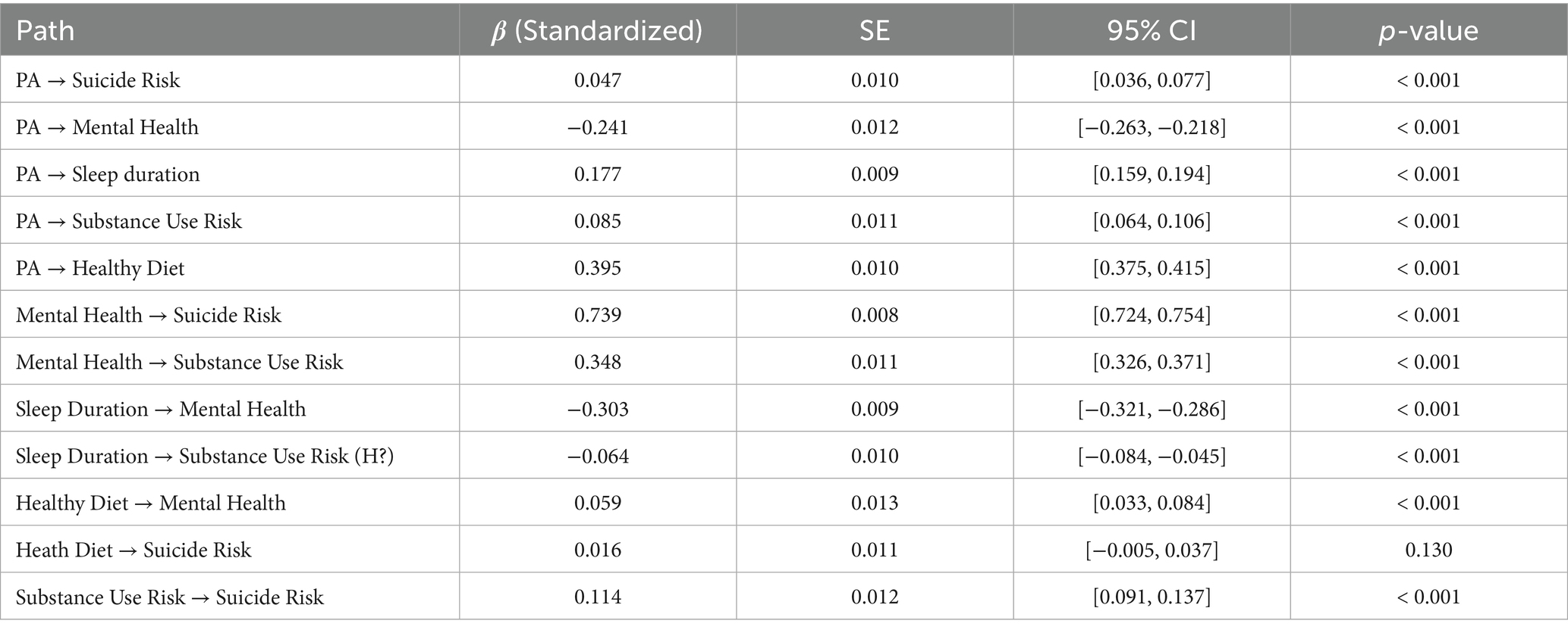 These results suggest that the effect of PA on SR and SUR may operate primarily through indirect pathways (e.g., via MH, SD, HD), providing initial support for the hypothesized mediation structure to be tested in the subsequent analysis.