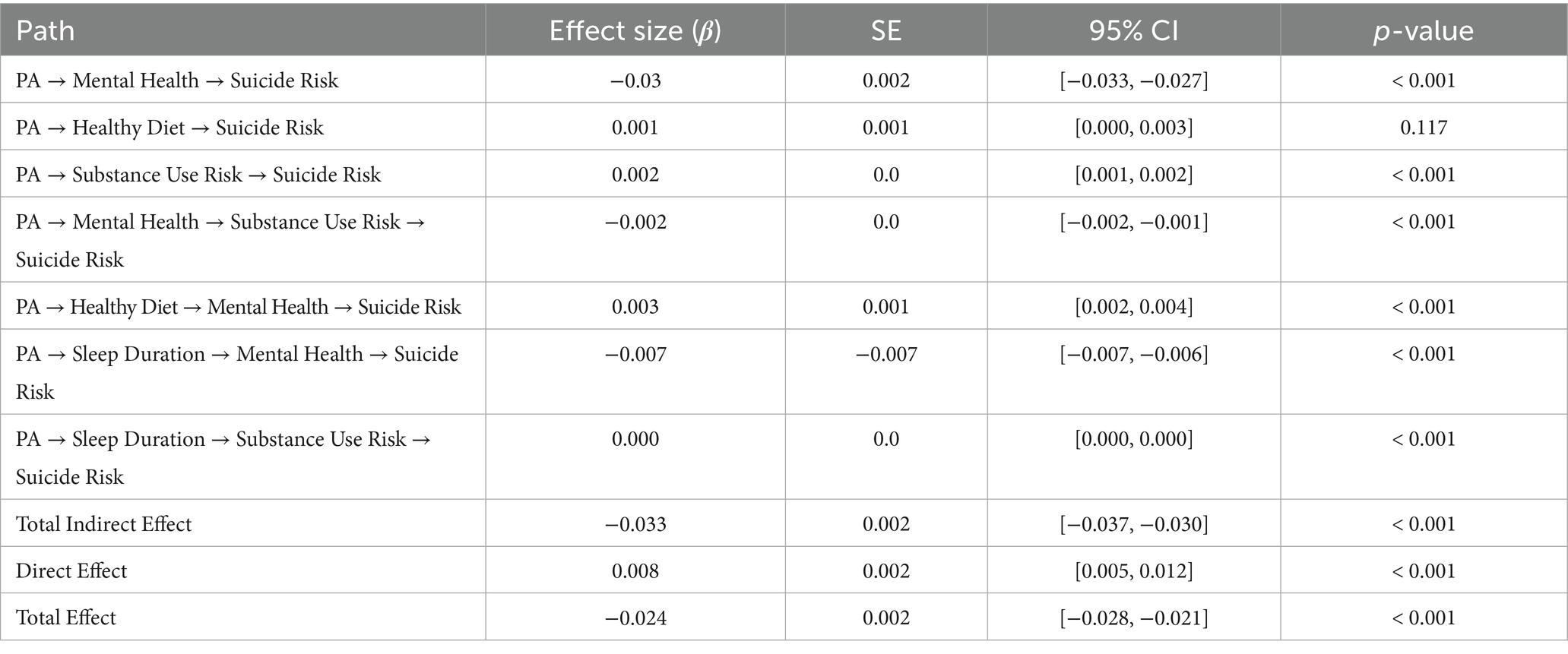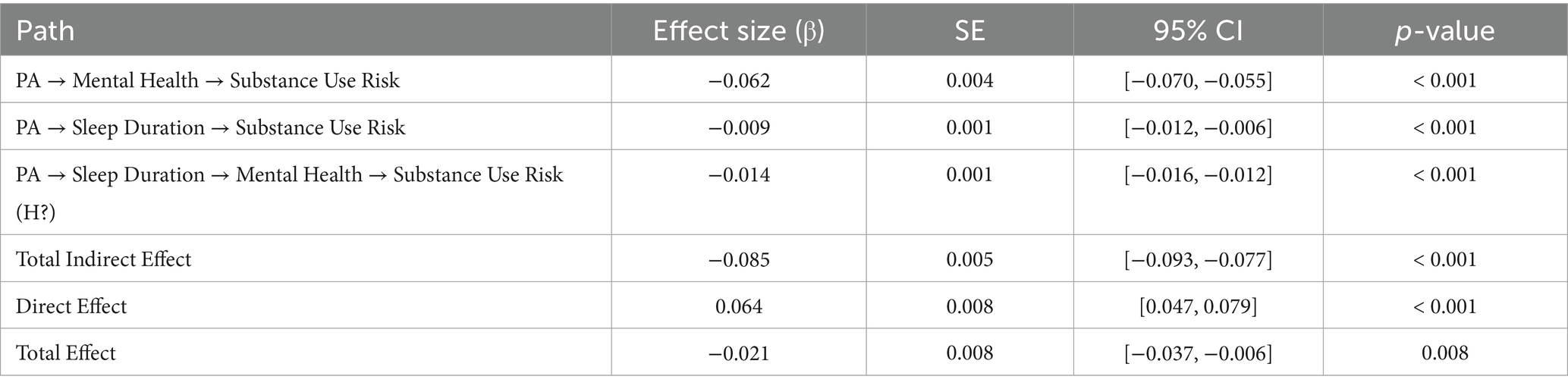 Table 7 presents the standardized direct, indirect, and total effects from PA to SR. The total effect (β = −0.024, 95% CI [−0.028, −0.021], p < 0.001) demonstrates that higher levels of PA significantly predict lower levels of SR, thereby supporting H2b.