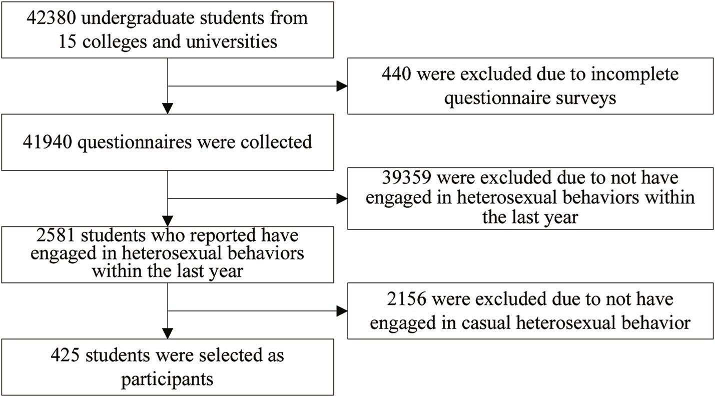 The participants were college students who reported engaging in casual heterosexual encounters during the previous year. The inclusion criteria for the participants are students from the selected class who are willing to participate in the questionnaire survey with informed consent. The exclusion criteria for participants are students from non sampled classes or those who refuse to participate in the questionnaire survey with informed consent. In total, 42,380 students were surveyed and 440 incomplete questionnaires were excluded, resulting in 41,940 valid responses. Among them, 2,581 college students reported involvement in heterosexual activities in the previous year, representing 6.15% of the total student population. Specifically, 425 college students reported engaging in casual heterosexual encounters in the previous year, accounting for 16.5% of students who engaged in heterosexual activities. Figure 1 illustrates a flowchart detailing the participant inclusion and exclusion processes.