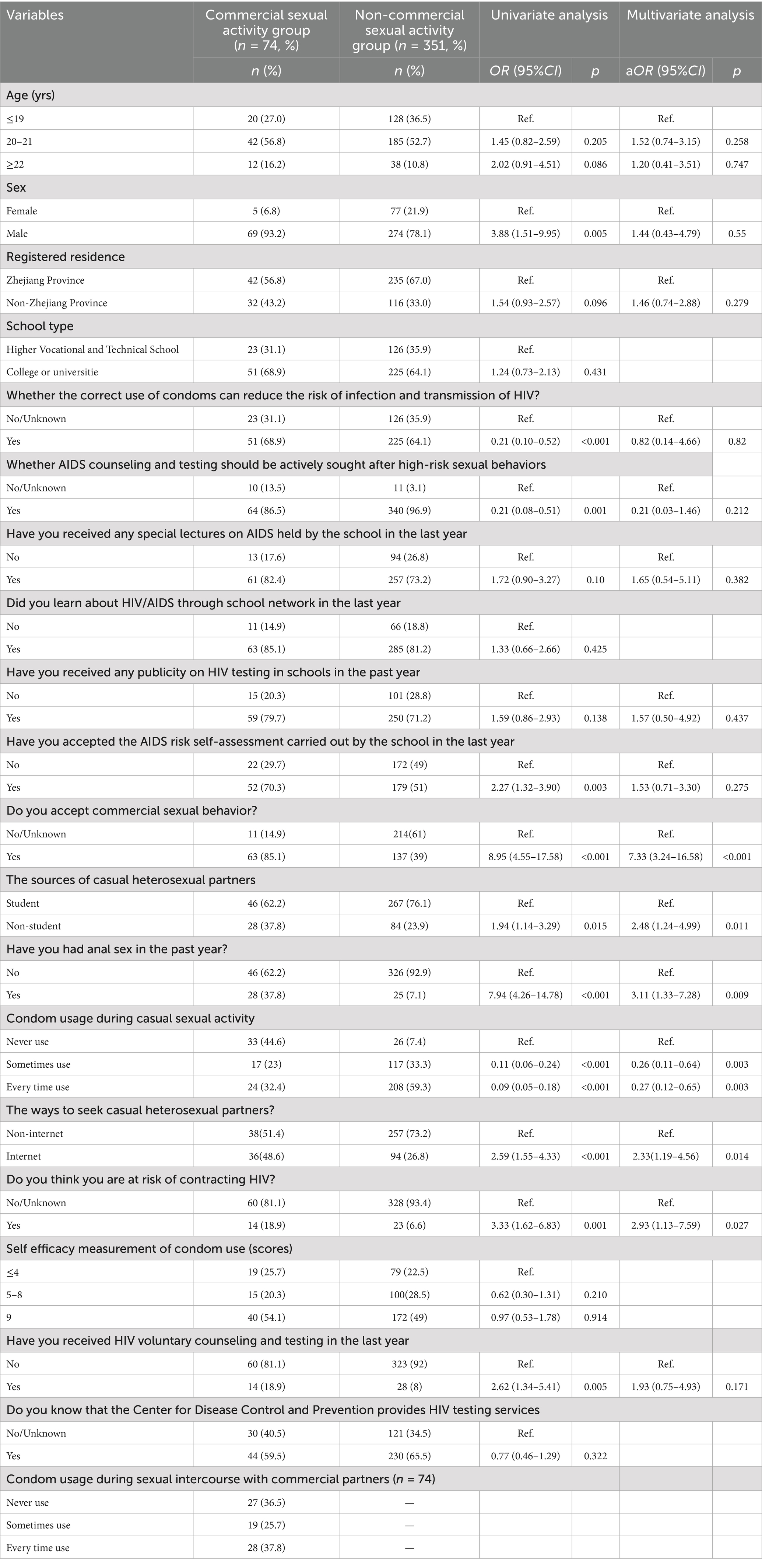 Results: In total, 42,380 students were surveyed and 440 incomplete questionnaires were excluded, resulting in 41,940 valid responses. Among them, 2,581 college students reported involvement in heterosexual activities in the previous year, representing 6.15% of the total student population. Specifically, 425 college students reported engaging in casual heterosexual behavior in the previous year, accounting for 16.5% of students who engaged in heterosexual activities. Of these, 74 (17.4%) students had engaged in commercial sex (average age, 19.99 ± 1.22 years). Multivariate logistic regression analysis indicated that accepting commercial sex [adjusted odds ratio (aOR) 7.33, 95% confidence interval (CI) 3.24–16.58], opposite-sex partners being non-students (aOR2.48, 95% CI 1.24–4.99), recent anal intercourse (aOR3.11, 95% CI 1.33–7.28), seeking casual partners on the Internet rather than offline (aOR2.33, 95% CI 1.19–4.56), perceived risk of HIV infection (aOR2.93, 95% CI 1.13–7.59), and consistent condom use during casual sex (aOR0.27, 95% CI0.12–0.65) or sometimes/often use (aOR0.26, 95% CI0.11–0.64) compared with never using a condom were independent factors associated with the occurrence of commercial sex among college students who had engaged in casual heterosexual behaviors in the past year.