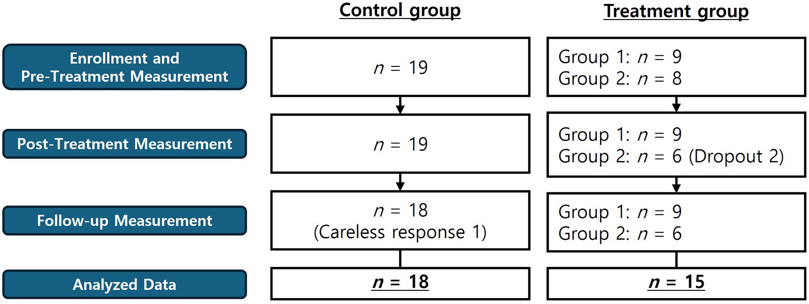 Flowchart comparing control and treatment groups across four phases: Enrollment, Post-Treatment, Follow-Up, and Data Analysis. Control group maintains nineteen in all phases, with one response excluded for carelessness. Treatment group starts with group one and group two as nine and eight, respectively; ends with nine and six, analyzing fifteen after two dropouts.