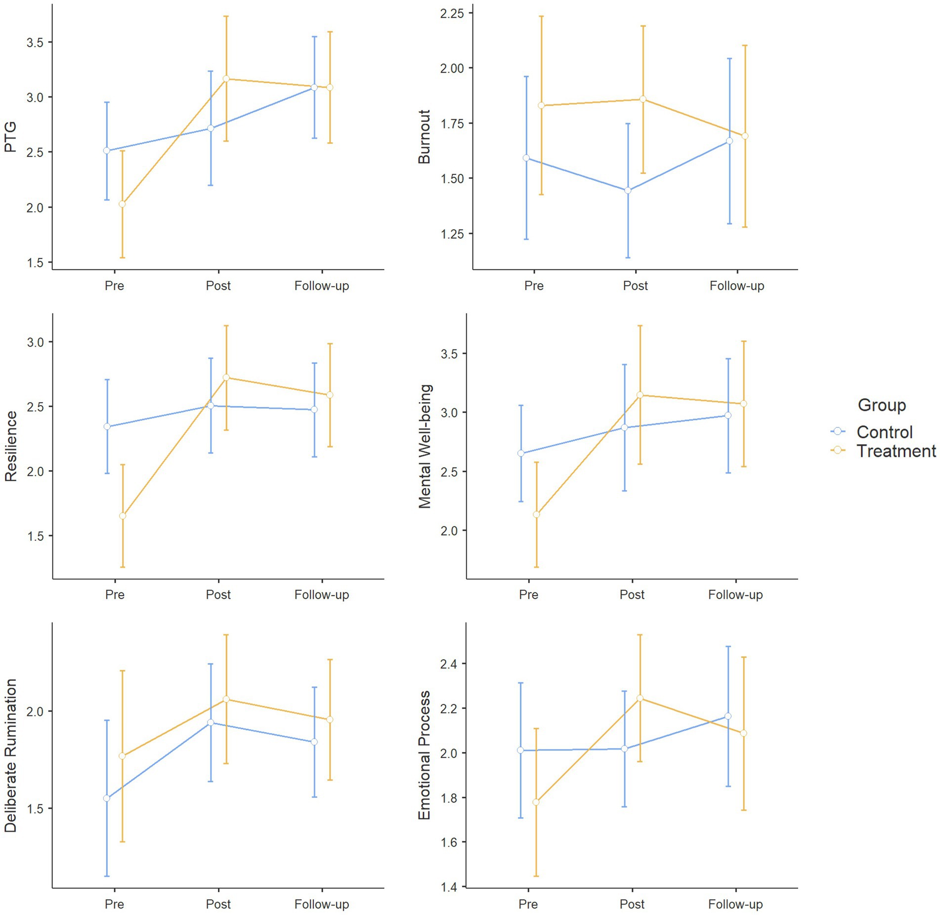Six line graphs comparing control and treatment groups over three periods: pre, post, and follow-up. Metrics include PTG, Burnout, Resilience, Mental Well-being, Deliberate Rumination, and Emotional Process. Two groups show different trends over time, with error bars indicating data variability. Control is in blue, treatment in orange.