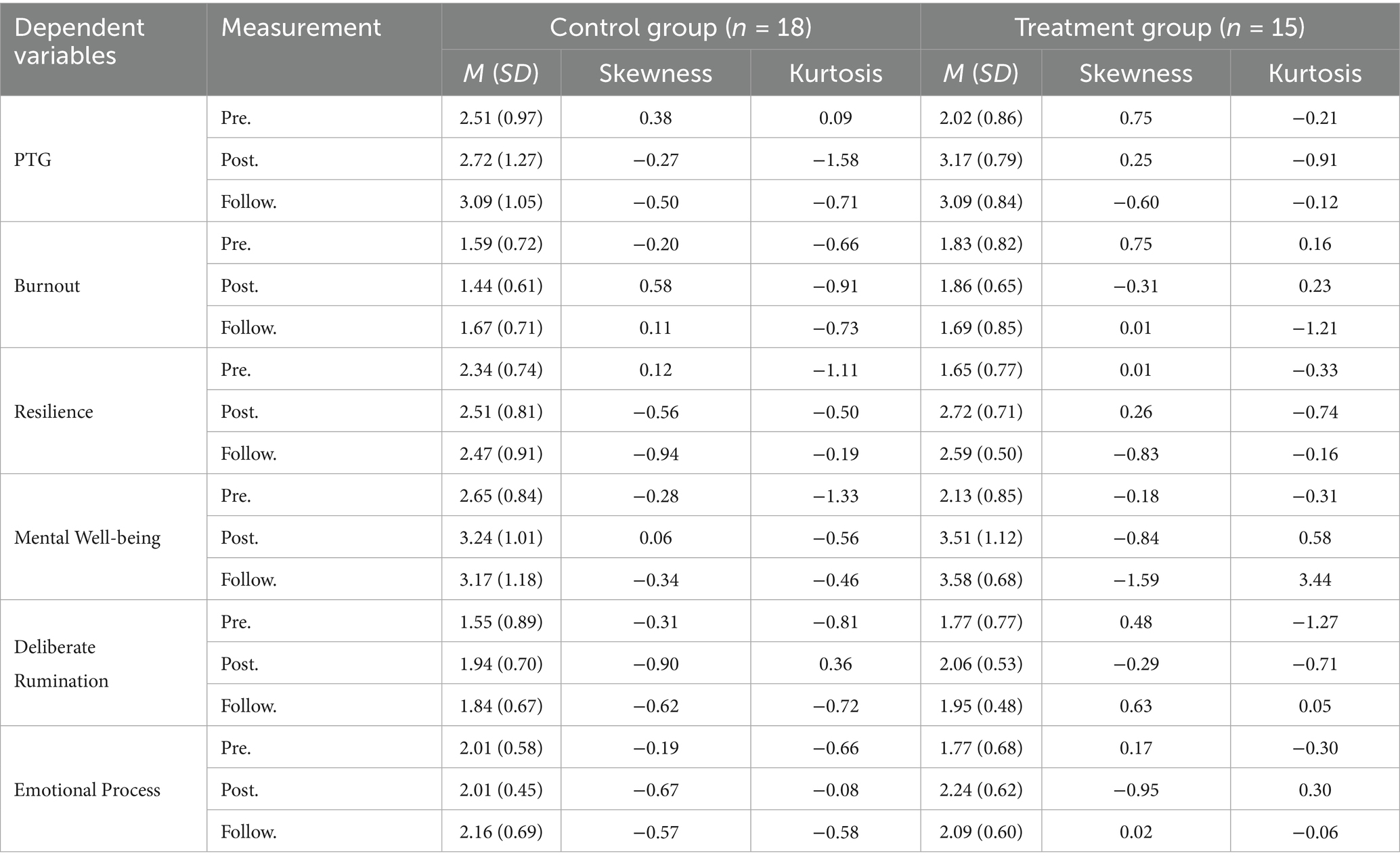 The main hypotheses in this study were as follows. The first hypothesis was that the treatment group would show decreased burnout and improved emotional wellbeing, PTG, resilience, deliberate rumination, and emotional processing compared with the control group after completing the program. The second hypothesis was that the changes in measured variables in the treatment group compared with the control group would be maintained even at follow-up.