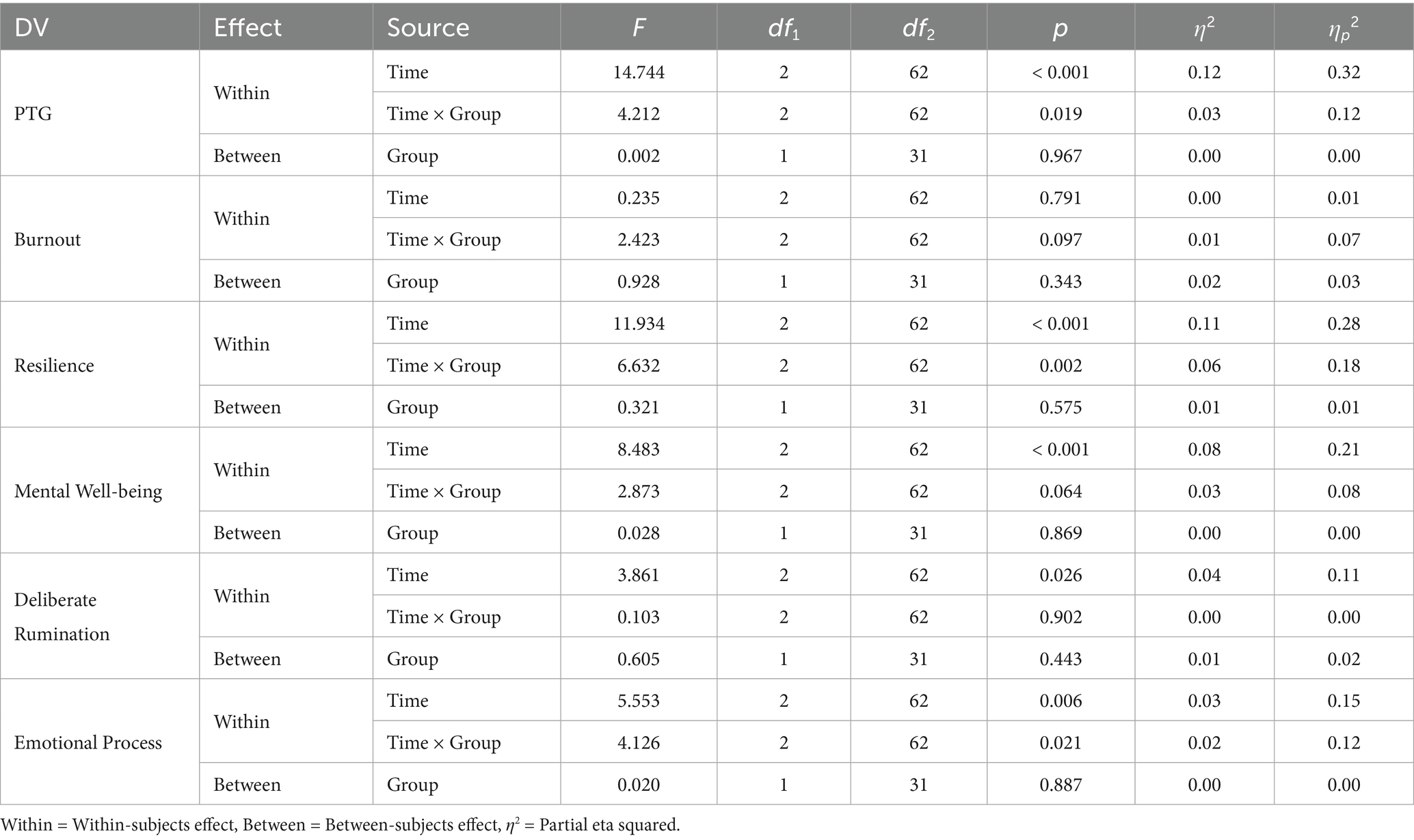 Results: Using a repeated-measures analysis of variance, the treatment group showed increased PTG, resilience, mental wellbeing, and emotion processing after the intervention compared with the control group, and this increase was maintained in the follow-up. Although the effect on burnout was not statistically significant, there was a trend for relatively decreased burnout in the treatment group.