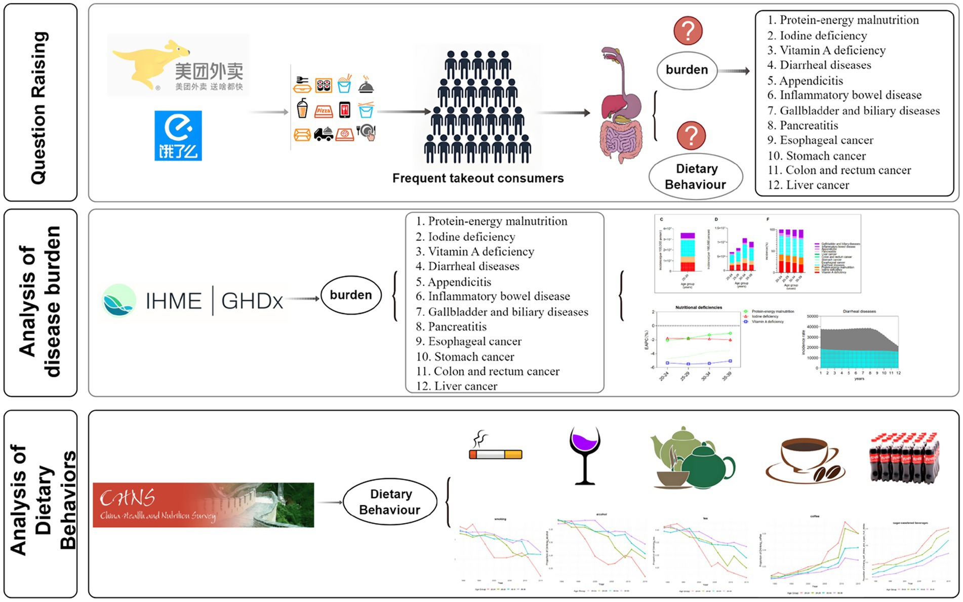 Over the past 11 years, China’s takeout market has expanded by more than thirtyfold since 2011 (1), predominantly driven by young adults—a demographic that constitutes the core consumer base of food delivery platforms due to their pursuit of convenience and digital engagement. College students and post-90s individuals in their first marriage have become the main force of takeout consumption (2, 3). The two predominant food delivery platforms, Meituan, established in 2010, and Ele.me, founded in 2009, collectively process nearly two million orders daily (4). The advent of COVID-19 and subsequent lockdown measures have increasingly normalized takeout food as a viable alternative to home-cooked meals (5). Coupled with the accelerated pace of life, young adults, driven by time constraints, convenience, and the lure of novel culinary experiences, are showing a growing reliance on takeout options. This shift has profoundly impacted their eating habits and nutritional profiles, posing significant challenges to public health and the societal framework in China (6). Despite these dramatic changes, the epidemiological landscape, particularly concerning diet-related diseases such as nutritional deficiencies and gastrointestinal disorders (both benign and malignant), and alterations in dietary behaviors over the past decade, remains inadequately explored.