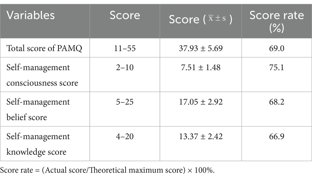 The results of this study indicate that the average score rate for the PAMQ among ICU nurses was 69.0%. The scores for the related self-management awareness, self-management beliefs, and self-management knowledge dimensions were 75.1, 68.2, and 66.9%, respectively, which needed to be improved. This is consistent with the findings of Zhang et al. (25), indicating that while these nurses are aware of LBP self-management, they lack sufficient knowledge reserves, skills, and confidence in coping with LBP. Several factors may contribute to this observation: (1) Individual Level: nurses’ lack of awareness of LBP hazards, lack of self-management knowledge, and weak management belief were the internal factors of their low self-management activation. (2) Organizational Level: The low self-management activity of nurses is externally influenced by factors such as the insufficient provision of patient-handling equipment in ward areas, coupled with a heavy workload (26), and a lack of organizational policies and training programs focused on preventing LBP. Relevant studies have indicated that nurses’ low awareness of LBP prevention, their level of knowledge, and whether they have received LBP prevention training are closely related to the incidence of LBP (27). It is recommended that nursing managers prioritize the implementation of LBP self-management education, prevention training courses, and corresponding assessments. This will enable nurses to correctly understand LBP, cultivate a positive awareness and belief in managing LBP, enhance their ability to cope with LBP, thereby preventing and alleviating the occurrence and progression of LBP.