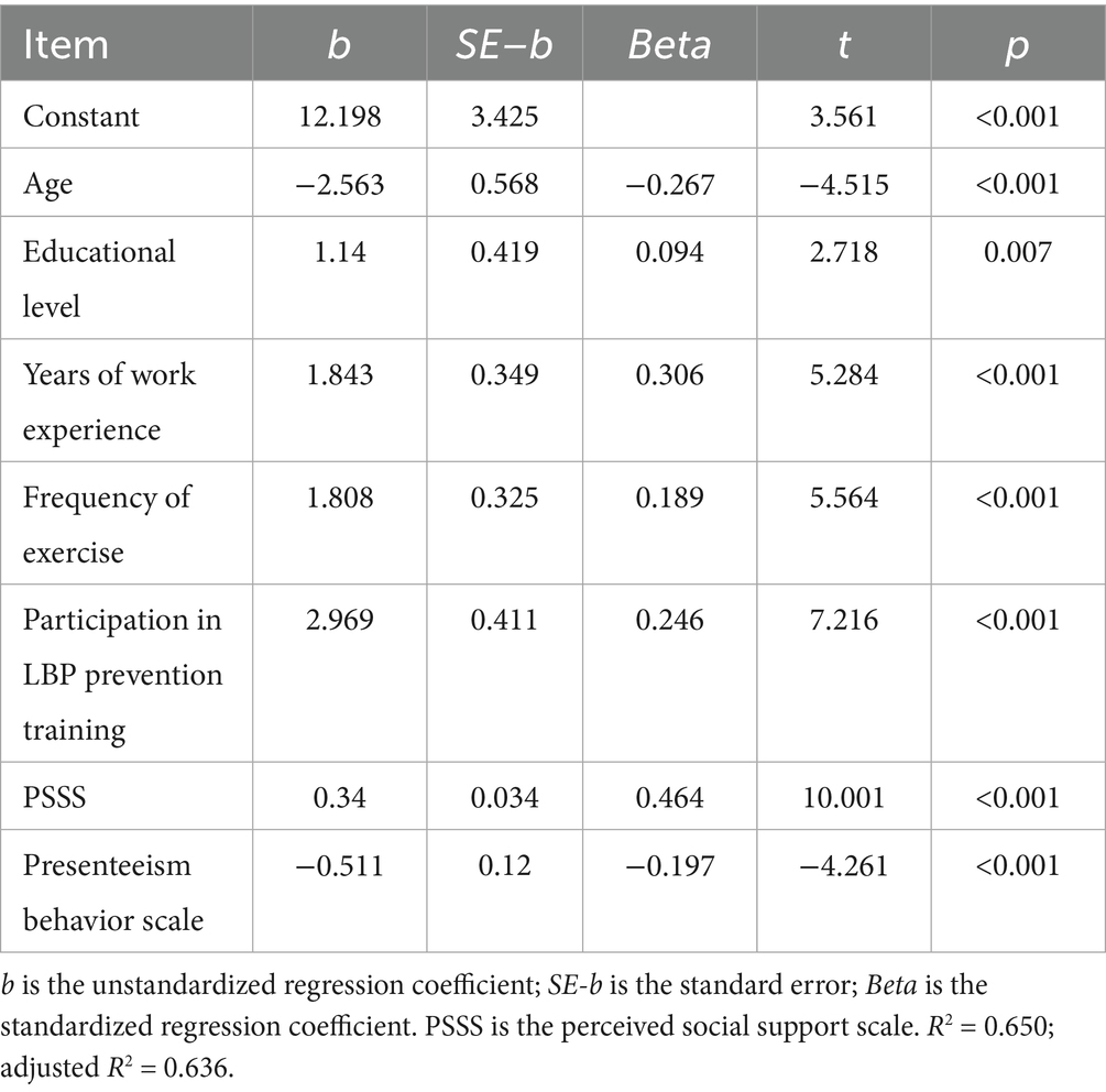 Multiple linear regression analysis was conducted, with the PAMQ score of ICU nurses as the dependent variable, and the statistically significant variables from the univariate analysis, along with the scores of the Attendance Behaviorism Scale and the PSSS, as the independent variables. The results indicated that age, educational level, years of work experience, frequency of exercise, participation in LBP prevention training, presenteeism, and PSSS score were significantly associated with the self-management activation of LBP among ICU nurses, collectively explaining 63.6% of the total variance. The specific data are presented in Table 4.