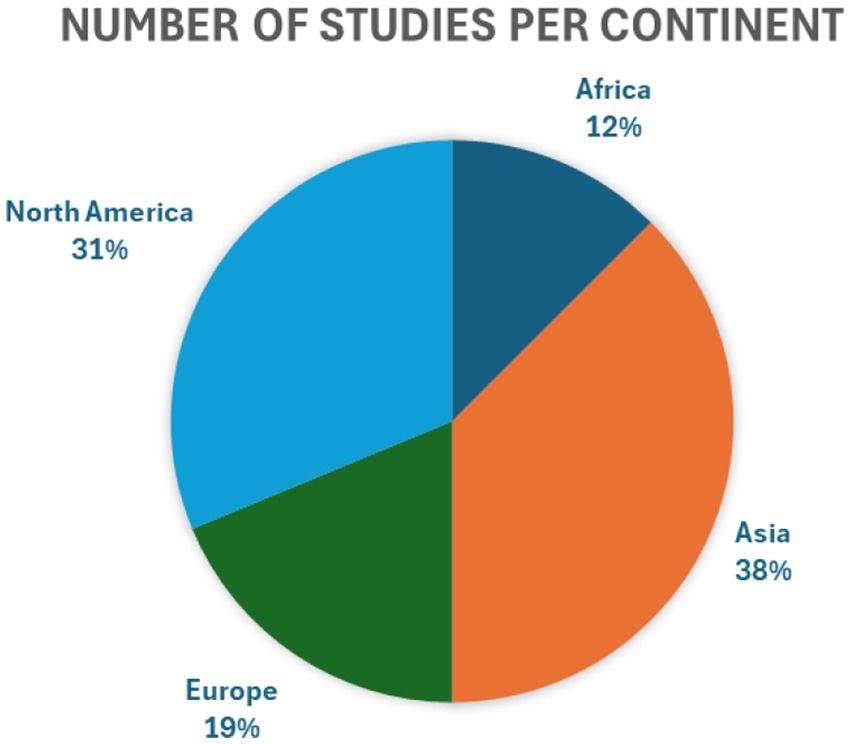 The review included 16 studies involving physicians in obstetrics and gynaecology (13–27). Ten of these studies provided a comparison between residency in gynaecology and other specialties (14–17, 19, 21, 22, 26–28). In contrast, six studies did not clearly specify whether the comparison involved residency in gynaecology versus other residencies, or a general comparison between gynaecologists and physicians from other specialties (13, 18, 20, 23–25). The studies demonstrated overall high quality, encompassing 2,267 gynaecologists and 8,891 physicians from other specialties (13–28). The studies analysed come from 4 continents, as shown in Figure 2. A detailed description of the included studies is provided in Table 2. Studies that did not assess risk factors were also included and are presented in Table 1 and Figure 2.