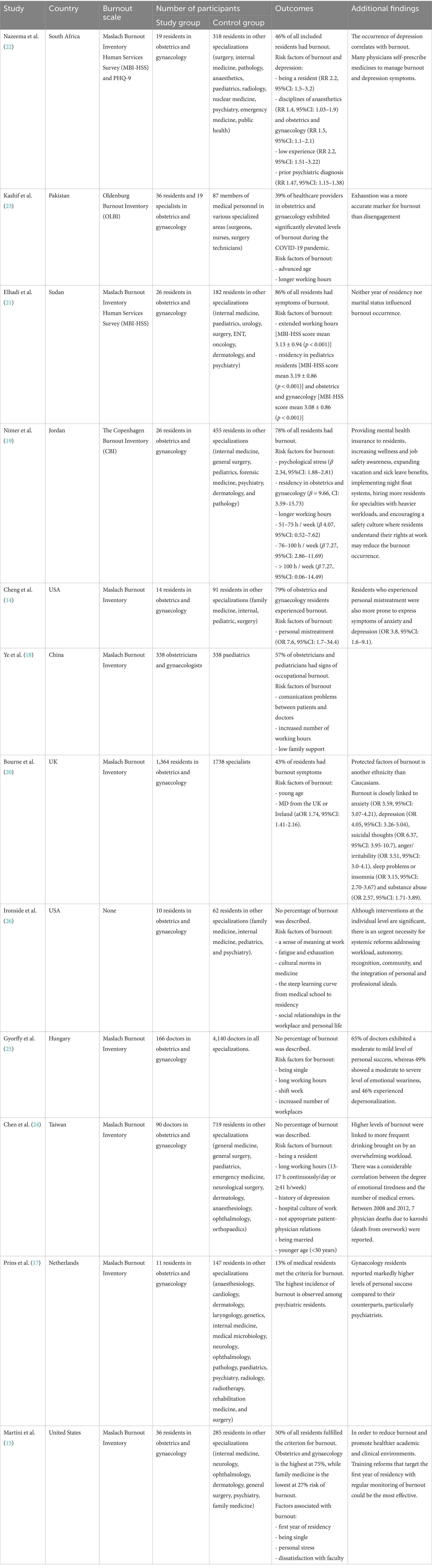 The emergency nature of the specialty, irregular and extended working hours, including night shifts and on-call duties, are among the most predisposing factors for occupational burnout among obstetrics and gynaecology residents. A similar association has been observed among residents in anaesthesiology and emergency medicine (4, 22, 29). Prolonged working hours have been identified as a significant risk factor for burnout among physicians (19, 21, 23–25). This is typically defined as working more than 10 consecutive hours per day or over 40 h per week (14). A 2001 survey by Defoe et al. (30) reported that obstetrics and gynaecology trainees worked between 61 and 100 h per week. More recent findings by Nimer et al. (19) revealed that, despite improvements in working conditions, over 30% of residents still reported working more than 75 h per week. Moradi et al. (31) identified an elevated risk of occupational burnout among obstetrics and gynaecology residents, identifying analogous risk factors, including quantitative work overload, role conflicts connected to work, and inadequacies in employment resources. Nonetheless, the reliability of this comparison must be regarded with caution, given that the overall quality of the research incorporated in their systematic analysis was rather low. Our evaluation primarily focused on recently published articles. It included studies utilising various tools for assessing burnout levels, such as the Oldenburg Burnout Inventory (OLBI) and the Maslach Burnout Inventory (MBI).