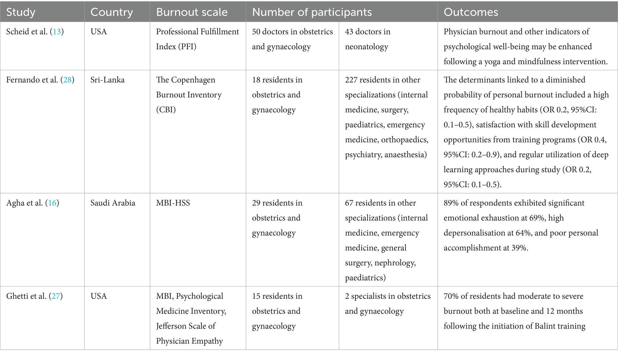 In addition to impaired psychosocial relationships with both patients and colleagues, young physicians face other serious challenges associated with burnout, including suicidal ideation, depression, and an increased propensity to emigrate among younger gynaecologists (20, 25). Moreover, physicians experiencing burnout frequently report a diminished sense of professional identity, reduced confidence in their problem-solving abilities, and feelings of isolation and misunderstanding. Research by Nazeema et al. (22) and Chen et al. (24) highlights that a personal or family history of psychiatric disorders even more predisposes individuals to burnout during residency. A psychiatric history, whether personal or familial, can increase susceptibility to the recurrence of mental health disorders and the emergence of new psychiatric symptoms during periods of prolonged psychological stress and overwhelming circumstances (34). The majority of the studies analysed identified obstetrics and gynaecology as one of the disciplines most susceptible to burnout (13–16, 18–27). However, Prins et al. (17) found that obstetricians and gynaecologists reported significantly higher levels of personal accomplishment compared to psychiatrists. Despite relatively high levels of personal accomplishment, symptoms of occupational and personal burnout, particularly in the context of inadequate psychosocial relationships, are associated with considerable emotional strain (17).