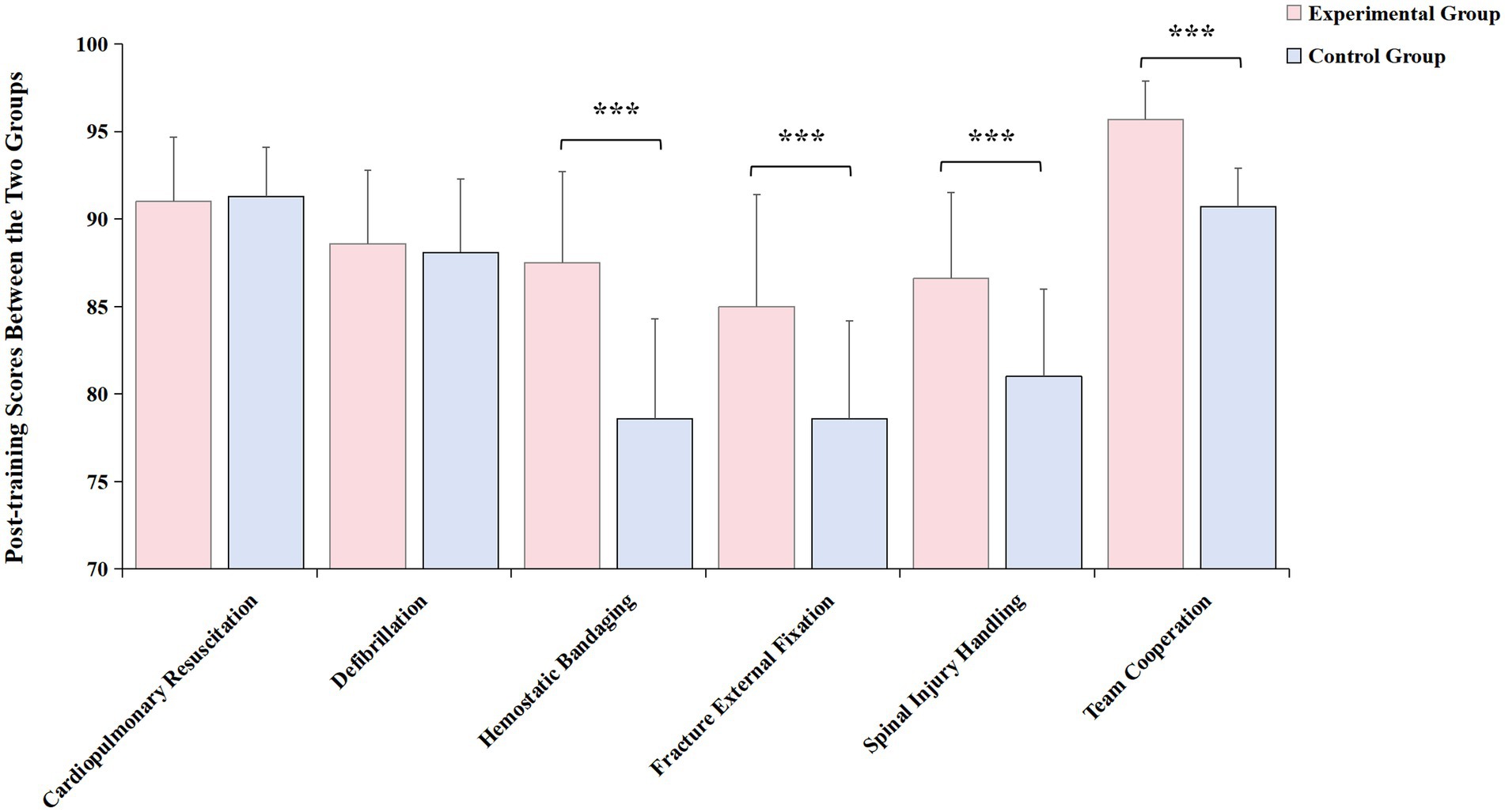 Figure 1. Comparison of post-training scores between the two groups of emergency department interns. Experimental group had significantly higher scores in hemostatic bandaging, fracture external fixation, spinal injury handling, and team cooperation compared to the control group. Red bar: experimental group; blue bar: control group. ***p < 0.001.
