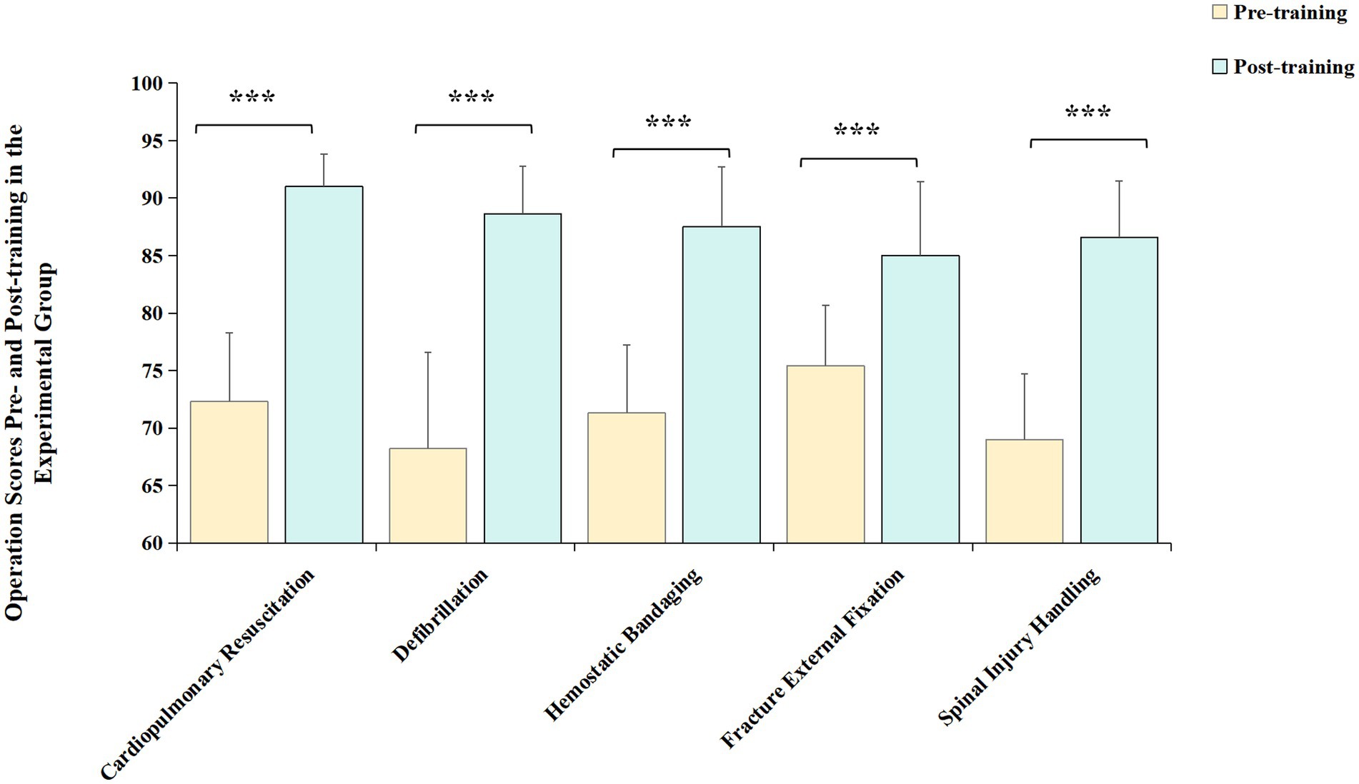 Figure 2. Comparison of operation scores pre- and post-training in the experimental group. The post-training scores for cardiopulmonary resuscitation, defibrillation, hemostatic bandaging, fracture external fixation, and spinal injury handling of experimental group were all significantly elevated, compared to pre-training scores. Yellow bar: pre-training scores of the experimental group; green bar: post-training scores of the experimental group. ***p < 0.001.