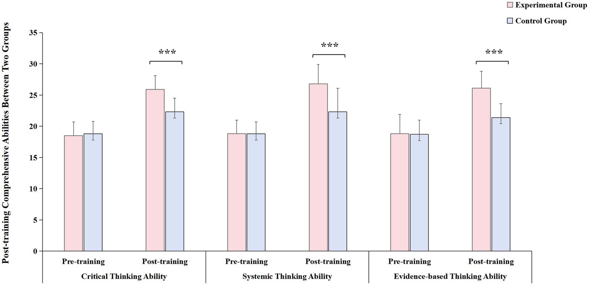 Figure 3. Comparison of post-training comprehensive abilities between two groups of emergency department interns. post-training, both groups demonstrated improved scores in critical thinking, systemic thinking, and evidence-based thinking abilities compared to pre-training scores, with the experimental group surpassing the control group. Red bar: experimental group; blue bar: control group. ***p < 0.001.