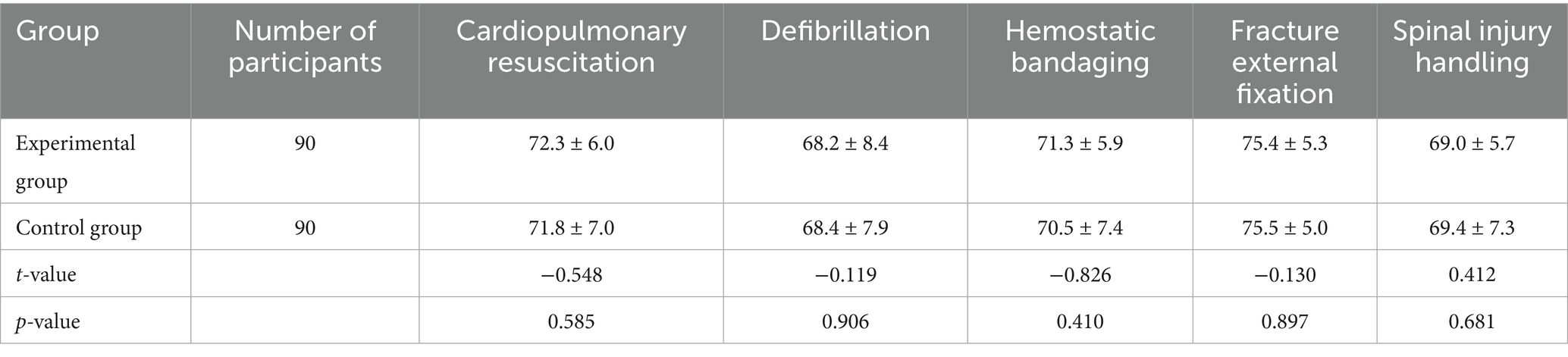 The comparison of pre-course preparation scores, encompassing cardiopulmonary resuscitation, defibrillation, hemostatic bandaging, fracture external fixation, and spinal injury handling, between the experimental and control groups revealed no statistically significant differences (p > 0.05), as illustrated in Table 2.