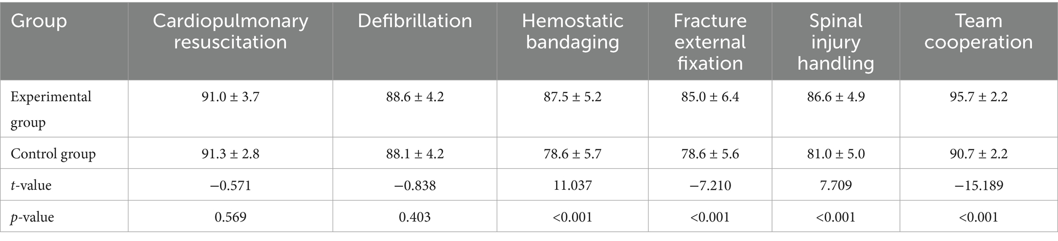 There were no statistically significant differences in the scores for cardiopulmonary resuscitation and defibrillation between the groups (Figure 1, both p > 0.05). However, the experimental group achieved higher scores in hemostatic bandaging, fracture external fixation, spinal injury handling, and team cooperation compared to the control group, with the differences being statistically significant (Figure 1, all p < 0.001), as detailed in Table 3.