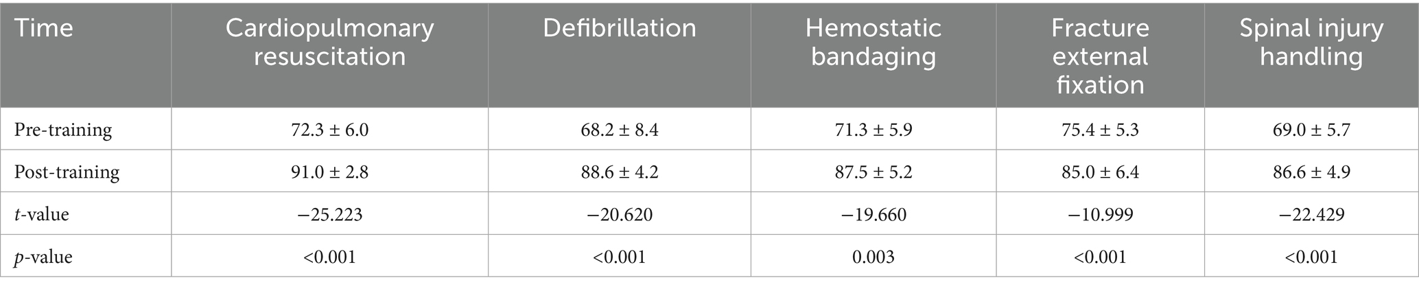 In the experimental group, post-training scores for cardiopulmonary resuscitation, defibrillation, hemostatic bandaging, fracture external fixation, and spinal injury handling were all elevated compared to pre-training scores, exhibiting statistically significant differences (Figure 2, all p < 0.001), as showcased in Table 4.