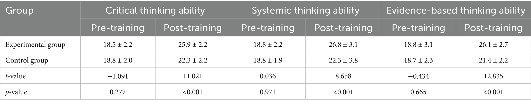 Before training, there was no statistically significant difference (p > 0.05) in clinical comprehensive abilities across all dimensions between the two groups of interns. Post-training, both groups demonstrated improved scores in critical thinking, systemic thinking, and evidence-based thinking abilities compared to pre-training scores, with the experimental group surpassing the control group. These differences were statistically significant (Figure 3, all p < 0.001), as illustrated in Table 5.