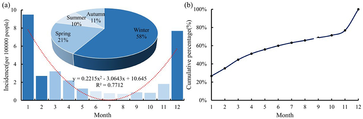 To visually illustrate the intra-annual distribution pattern, we fitted the multi-year averaged monthly influenza incidence and plotted the annual distribution curve. As shown in Figure 1a, the curve is an upward-opening parabola, with a trough in July and peaks in January and December, indicating a U-shaped variation on a monthly scale. The incidence is lowest in summer, accounting for about 10% of the annual total, followed by autumn, spring, and winter, which account for 11%, 21%, and 58%, respectively.