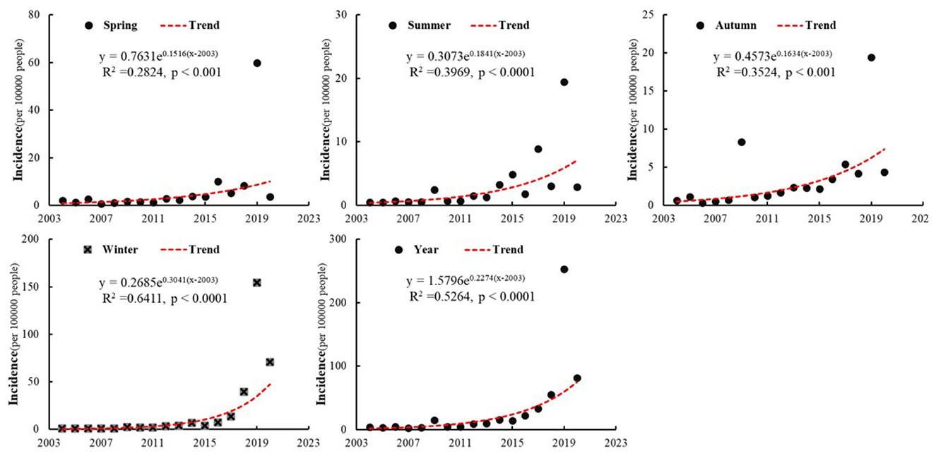 It is worth noting that, except for three provinces showing a nonsignificant decreasing trend in autumn, most provinces show an increasing trend. From 2004 to 2020, a total of 15 provinces exhibited significant growth across all seasons, ranked in order of highest to lowest growth rate as follows: Gansu, Liaoning, Hebei, Shanxi, Jiangxi, Fujian, Henan, Guangdong, Anhui, Zhejiang, Hubei, Hunan, Shaanxi, Shandong, and Hainan. Their annual growth rates range from 0.1168/a to 0.3989/a. The annual incidence in mainland China shows an increasing trend, with an average growth rate of 0.2303/a. Except for Guizhou and Sichuan, the growth trends of the remaining 28 provinces passed the significance test.