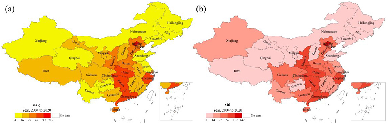 The average (avg) and standard deviation (std) of annual influenza incidence for each province in mainland China from 2004 to 2020 were calculated, and their spatial distribution is mapped (Figure 3). To highlight the spatial differences, the natural breaks method (53) was employed to classify the value range into five categories. From Figure 3a, it can be observed that the average number of cases per province varies significantly, with an overall average of 50 cases per 100,000 people. Beijing has the highest average incidence at 211.94 cases per 100,000 people, while Heilongjiang has the lowest at 4.19 cases per 100,000 people, representing a difference of more than 50 times. Provinces with higher averages are located in the southeastern region of China, while the northeastern and northwestern areas have relatively lower averages, overall showing a clustered pattern. The 10 provinces with significantly higher averages, in descending order, are Beijing, Zhejiang, Guangdong, Hunan, Hubei, Shaanxi, Hebei, Hainan, Henan, and Shanghai.