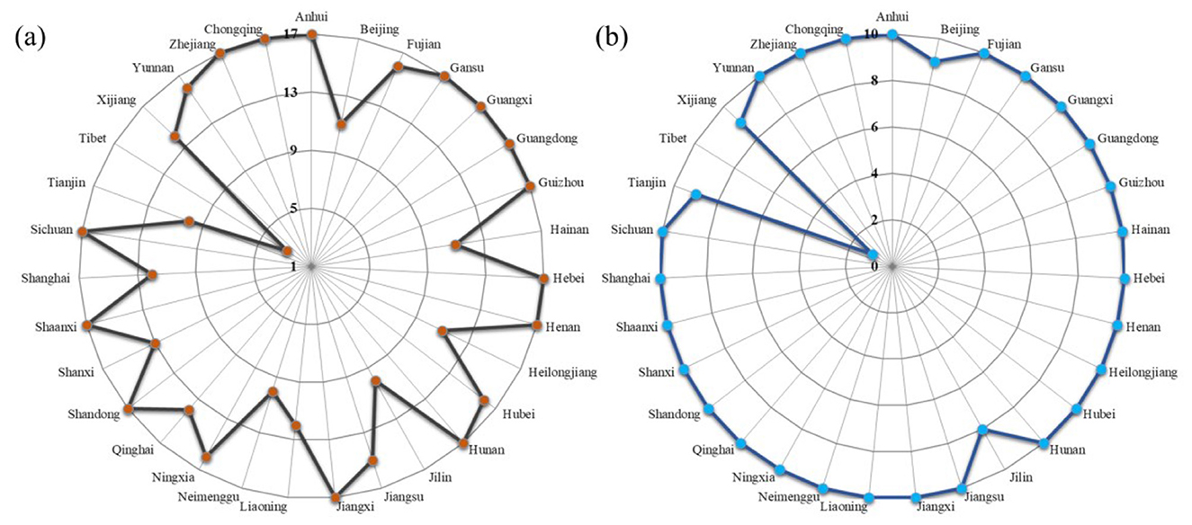From Figure 3b, it can be observed that the spatial distribution of std is largely similar to that of avg, with a correlation coefficient of r = 0.96 (p < 0.001). The ten provinces with significantly higher standards are ranked as follows: Beijing, Zhejiang, Hunan, Guangdong, Shaanxi, Hubei, Sichuan, Hainan, Henan, and Chongqing. Among these, eight provinces share the same ranking as average. This indicates that avg is correlated with std, meaning that provinces with higher averages tend to experience greater fluctuations and are therefore less stable. In summary, provinces with higher average values undergo greater fluctuations and are consequently more unstable, and vice versa.