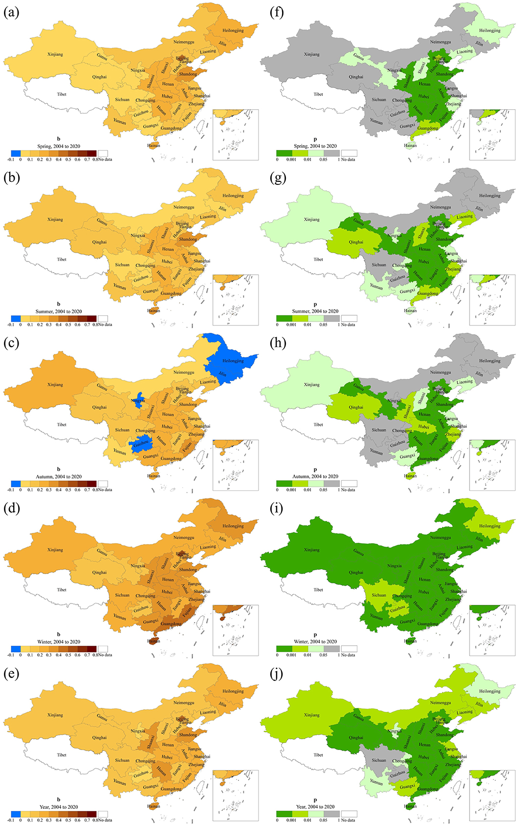 Figure 6. Spatial patterns of trend and significance of influenza incidence by season in mainland China, 2004–2020. b represents the change rate (a–e) and p-value is derived from the F test (f–j).