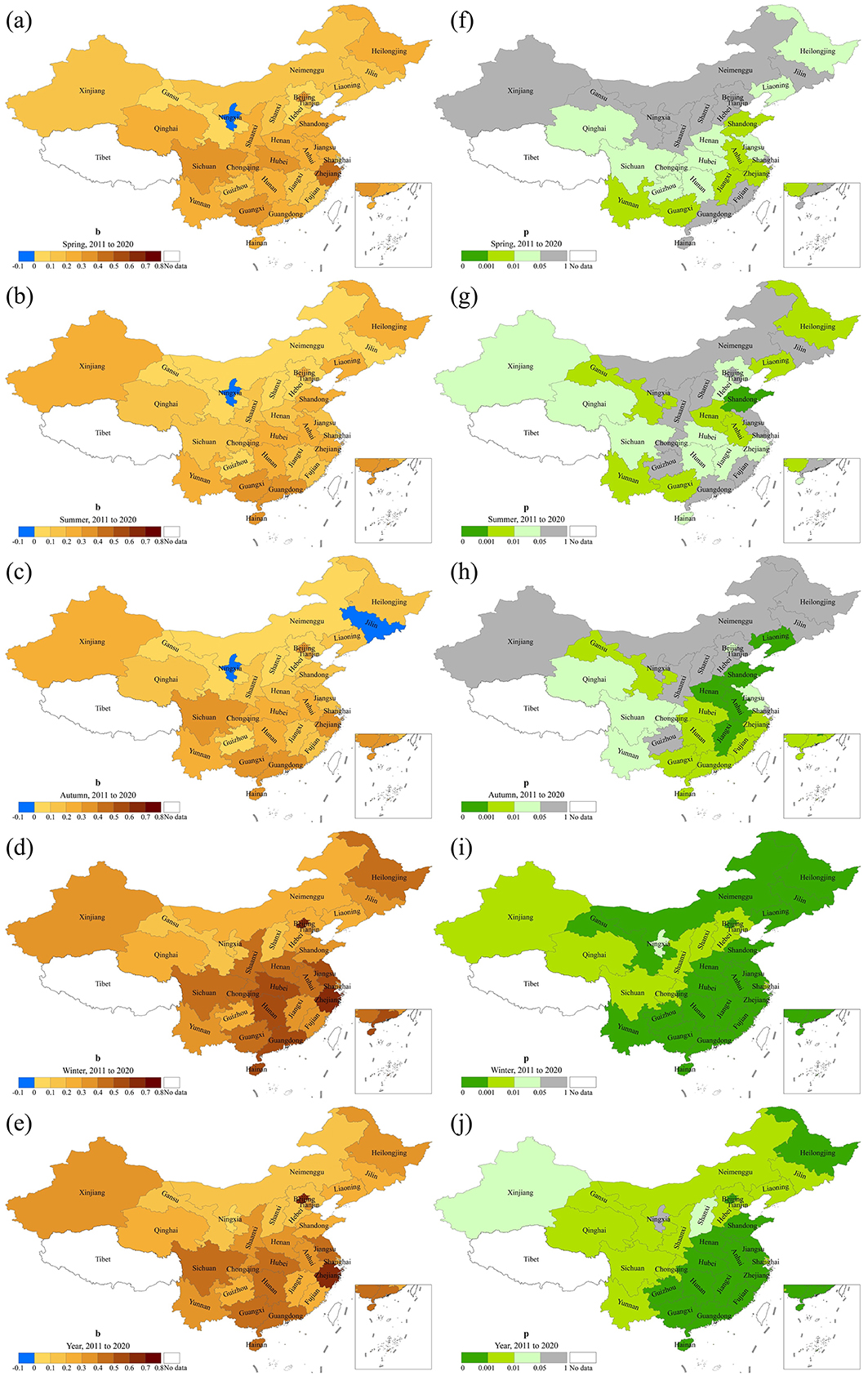 Figure 7. Spatial patterns of trend and significance of influenza incidence by season in mainland China, 2011–2020. b represents the rate of change (a–e) and p-value is derived from the F test (f–j).