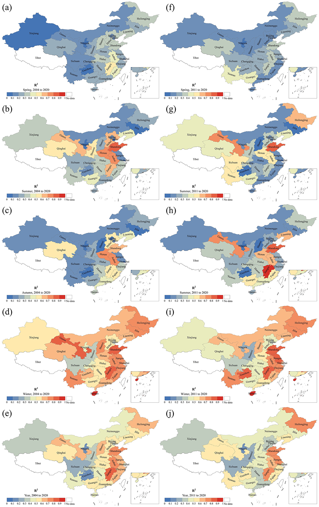 Figure 8 illustrates the Goodness of fit for the trend model of influenza incidence changes in mainland China from 2004 to 2020 and from 2011 to 2020, represented by R2. The left column shows the R2 values of the trend model for seasonal incidence changes from 2004 to 2020, while the right column presents those from 2011 to 2020. It can be observed that the average R2 values over 2004 to 2020, in descending order, are: winter (0.64) > summer (0.36) > autumn (0.30) > spring (0.25). The average R2 of the trend models for annual incidence across 30 provinces in mainland China is ~0.5. The top 10 provinces with the best-fitting results, in descending order, are: Hainan > Shandong > Beijing > Hunan > Shaanxi > Fujian > Anhui > Guangdong > Shanxi > Hubei. The average R2 from 2011 to 2020, in descending order, are: Winter (0.60) > Autumn (0.35) > Summer (0.32) > Spring (0.23). The R2 for the annual incidence across the 30 provinces in mainland China is 0.48. Provinces with an average R2 > 0.5 over the four seasons, in descending order, include: Shandong > Jiangxi > Gansu > Anhui > Henan > Heilongjiang > Liaoning > Yunnan > Guangxi > Hainan. The R2 values for the two periods, 2011–2020 and 2004–2020, show both similarities and differences. The similarity is that the best fit occurs in winter and the worst in spring in both periods. Additionally, provinces with higher R2 are mainly concentrated in the southeastern, central-western, and northeastern regions of China. Differences are evident in the varying value ranges and distributions of R2 within the same season.
