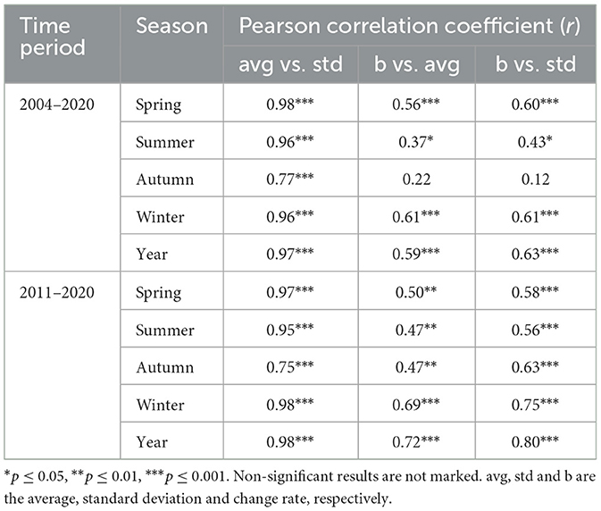 To explore the associations between characteristics, we examined the correlations among the annual change rates (b), average (avg), and standard deviation (std) of influenza incidence across 30 provinces in mainland China during the periods of 2004–2020 and 2011–2020 (Table 2). There are significant positive correlations among these three variables, except for non-significant correlations between b vs. avg, and b vs. std during autumn in 2004–2020. Avg and std are significantly positively correlated across all seasons during both periods, with r ≥ 0.75 (p < 0.001). This suggests that provinces with higher influenza incidence experience more intense fluctuations and greater variability. Overall, b is positively correlated with avg, with r ≥ 0.37, indicating that provinces with higher incidence tend to have greater growth. The correlation between b and std is stronger than that between b and avg, with r ≥ 0.43. The volatility of influenza incidence is linked with trends, indicating that greater volatility corresponds to larger interannual variability.