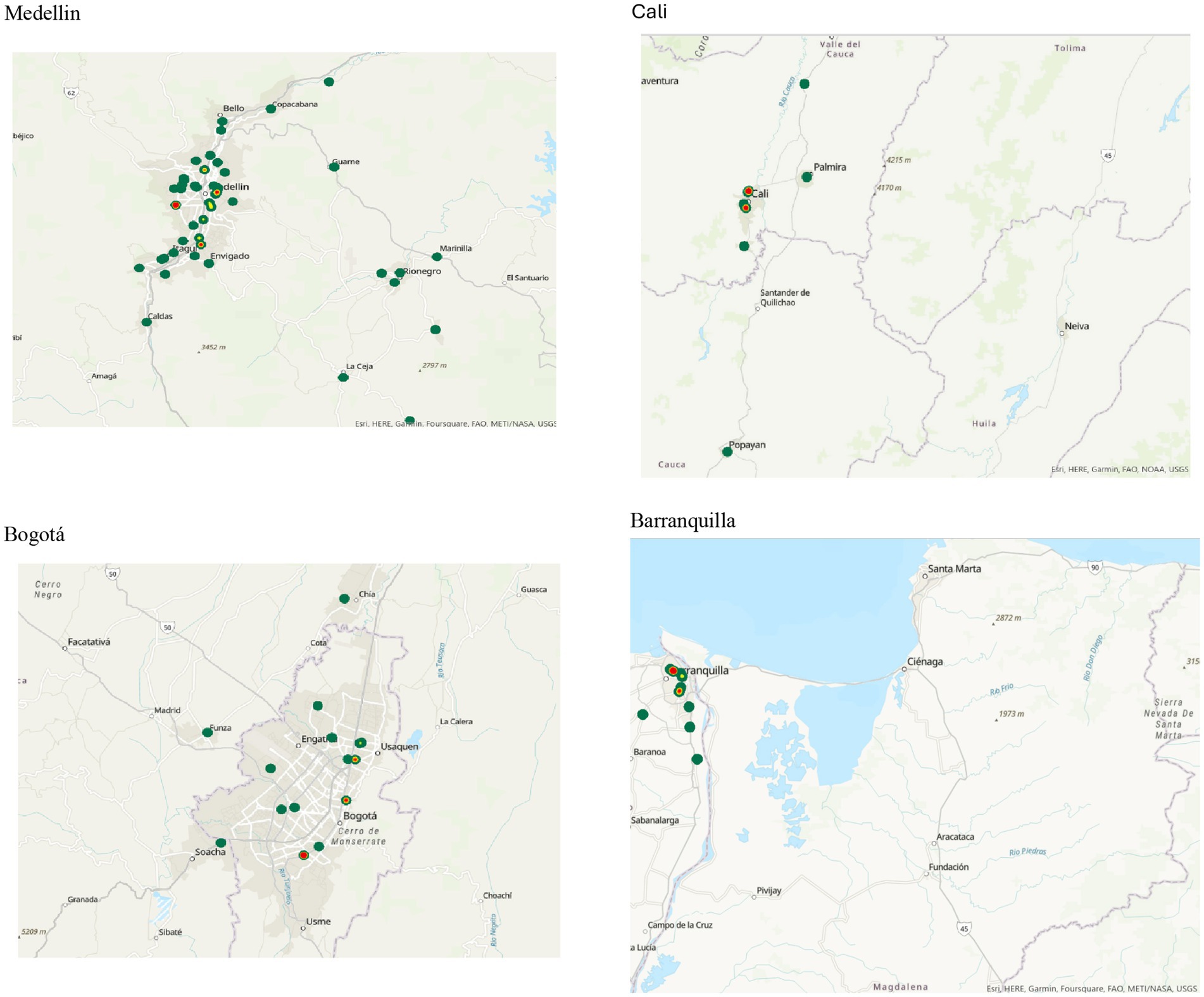 Figure 1 presents a national heat map illustrating the distribution of TM consultations across Colombia. Figure 2 illustrates the four main cities of Colombia—Medellín, Cali, Bogotá, and Barranquilla—and specifically highlights the areas of concentration of the patients’ Primary Care Units (PCUs), allowing the reader to visualize their geographic distribution in the urban, semiurban and rural areas.